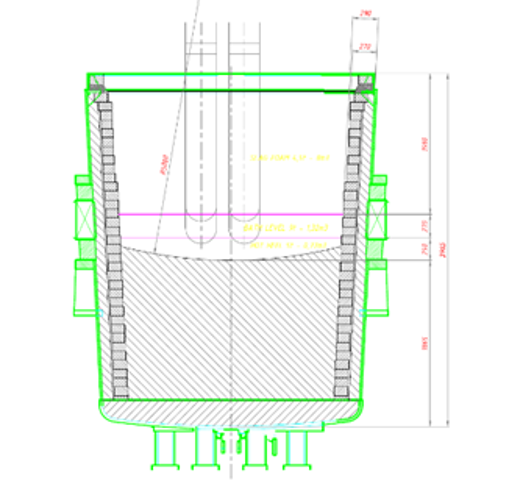 In Work Package 2 and 3, the basic and detailed designs for the adaptation of the Tenaris Dalmine Ladle Furnace to facilitate the Plasma Reactor smelting reduction process were completely finalized. Particularly Tenova engineered a dedicated container for hot metal transport using the existing Kirov machine. The refractory lining specification was defined to ensure resistance to high temperatures and chemical attack from molten metal and slag.