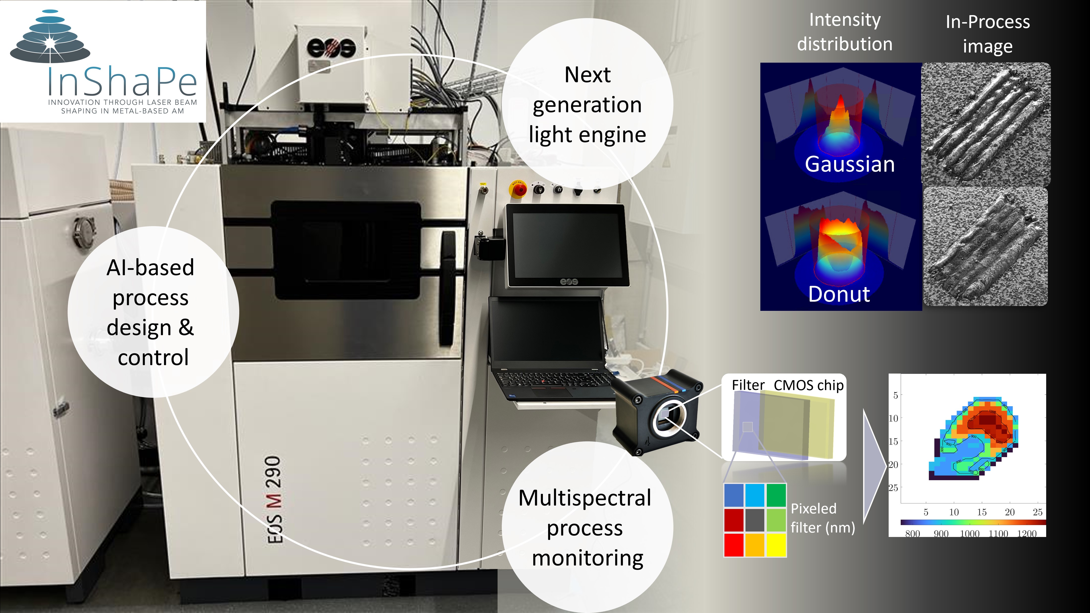 The InShaPe project aims to develop a novel powder bed fusion process for metal additive manufacturing. The research focuses on two technical innovations: (1) an AI-based laser beam shaping module and (2) a multi-spectral in-line process monitoring system. The goals are to achieve a 7 times higher build rate, to reduce costs by 50 %, and to use 60 % less energy and 30 % less scrap.