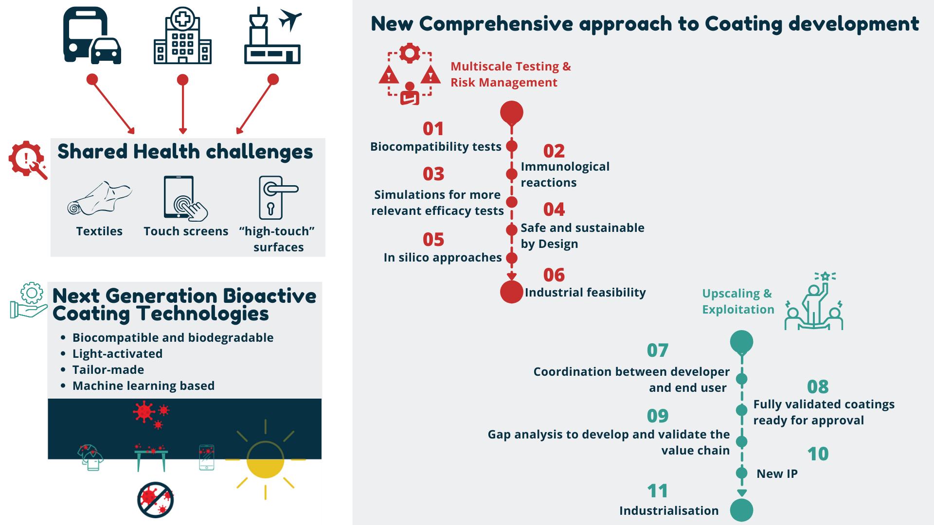 These coatings target four application areas: public spaces, medical rooms, textiles, and touch screens, each driven by an industrial partner. An schematic overview of the NOVA’s concept is attached (Figure: NOVA will deploy state-of-the-art antimicrobial coatings and demonstrate their relevance in use cases). NOVA will deploy state-of-the-art antimicrobial coatings(NOVA solutions) and demonstrate their relevance in relevant environments (use cases). The project's antimicrobial coatings are based on four pillars: contact-killing biopolymer blends and three light-triggered nanoparticle-based coatings with varying functions. By exploring multiple technologies and their combinations, NOVA provides holistic solutions for specific needs. Microbiologists in the NOVA team are crucial for evaluating antimicrobial surfaces and coatings with robust, reproducible data reflecting real-world effectiveness. Current methods are inadequate, so NOVA will develop new antibacterial, antifungal, and antiviral testing methods for operational conditions. Ensuring the safety of antimicrobial coatings for human health and the environment, NOVA prioritizes sustainable design to minimize negative impacts and conserve resources. An academic team customizes toxicity testing methodologies for coatings, ensuring thorough safety. NOVA generates extensive research data across disciplines, managed by experts in software engineering, algorithms, and data science. They will implement FAIR (Findable, Accessible, Interoperable, Reusable) principles and develop in-silico models for faster and more efficient formulation optimization, predictive modeling, and process optimization. By leveraging data-driven insights, NOVA aims to advance coating technology, creating high-performance, sustainable solutions for various industries. An overview of the NOVA workflow, interconnection of work packages (WPs) and positioning within the TRL scale is attached (Figure: NOVA workflow, interconnection of work packages and positioning within the TRL scale).