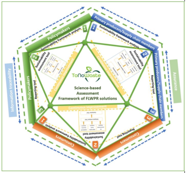 ToNoWaste will develop science and evidence-based assessment and ICT tools and data, connecting with previous EU funded projects and inspire market actors to use them to make better decisions towards a more sustainable food production and consumption patterns. It starts from investigating what best decision means regarding FLWPR actions in fresh food value chain. It is an open innovation ecosystem designed to take advantage from expert knowledge and previous results for the identification of Social, Technical/Environmental, Economic, Political/legal, Ethical & Demographic root causes and to collaborate with ongoing R&I actions to propose integral FLWPR solutions.