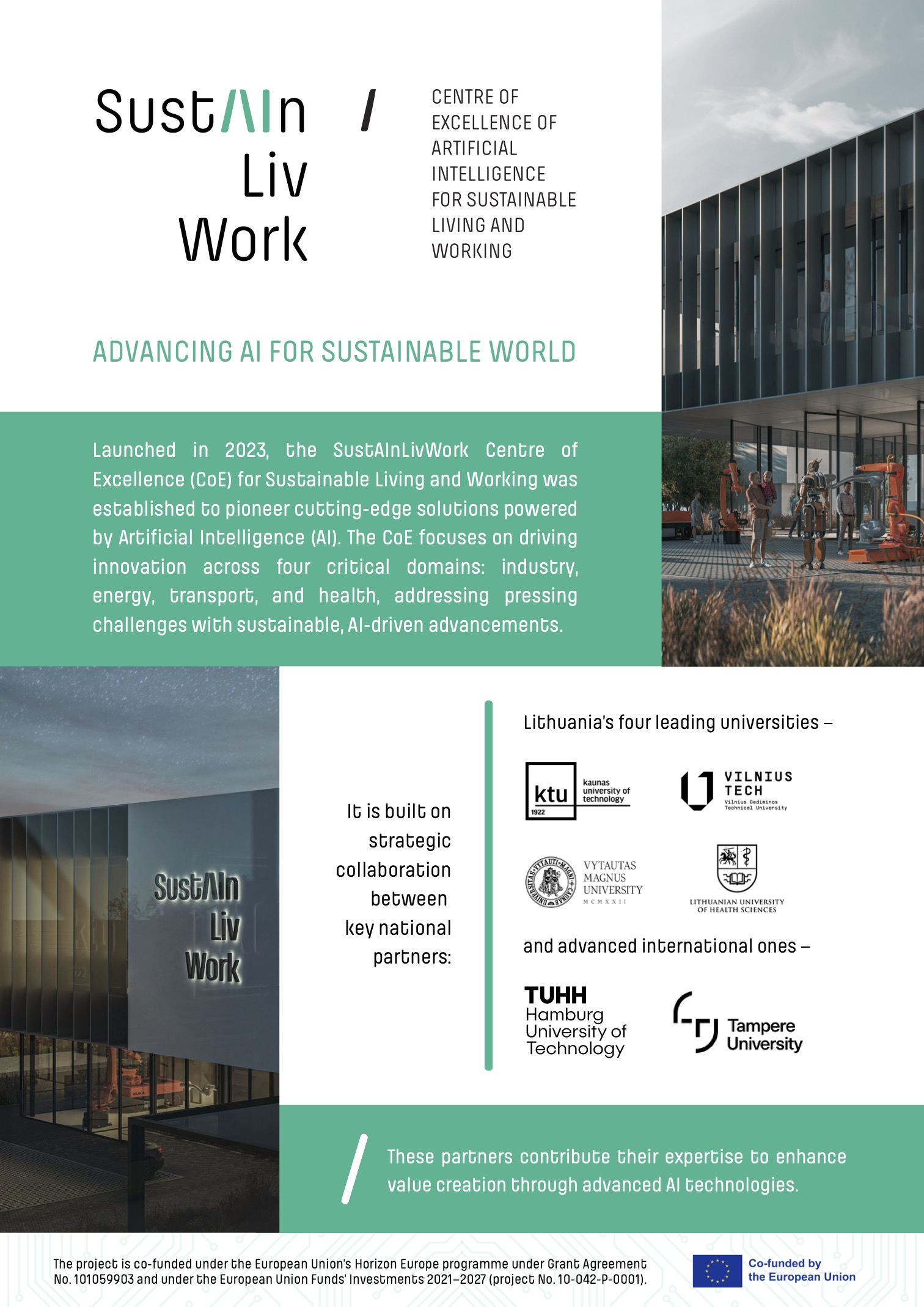 To address these gaps, SustAInLivWork is establishing a Centre of Excellence (CoE) dedicated to AI-driven sustainable innovations. The CoE brings together four leading Lithuanian universities - Kaunas University of Technology (KTU), Vilnius Gediminas Technical University (VILNIUS TECH), Vytautas Magnus University (VMU), and the Lithuanian University of Health Sciences (LSMU) - together with two advanced partners: Tampere University (TAU) in Finland and Hamburg University of Technology (TUHH) in Germany.