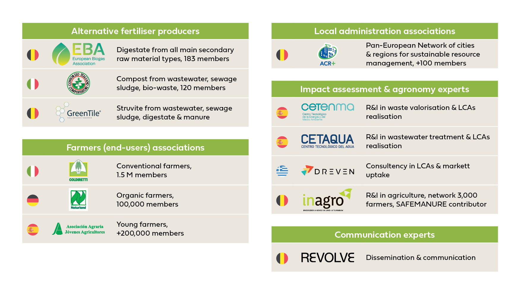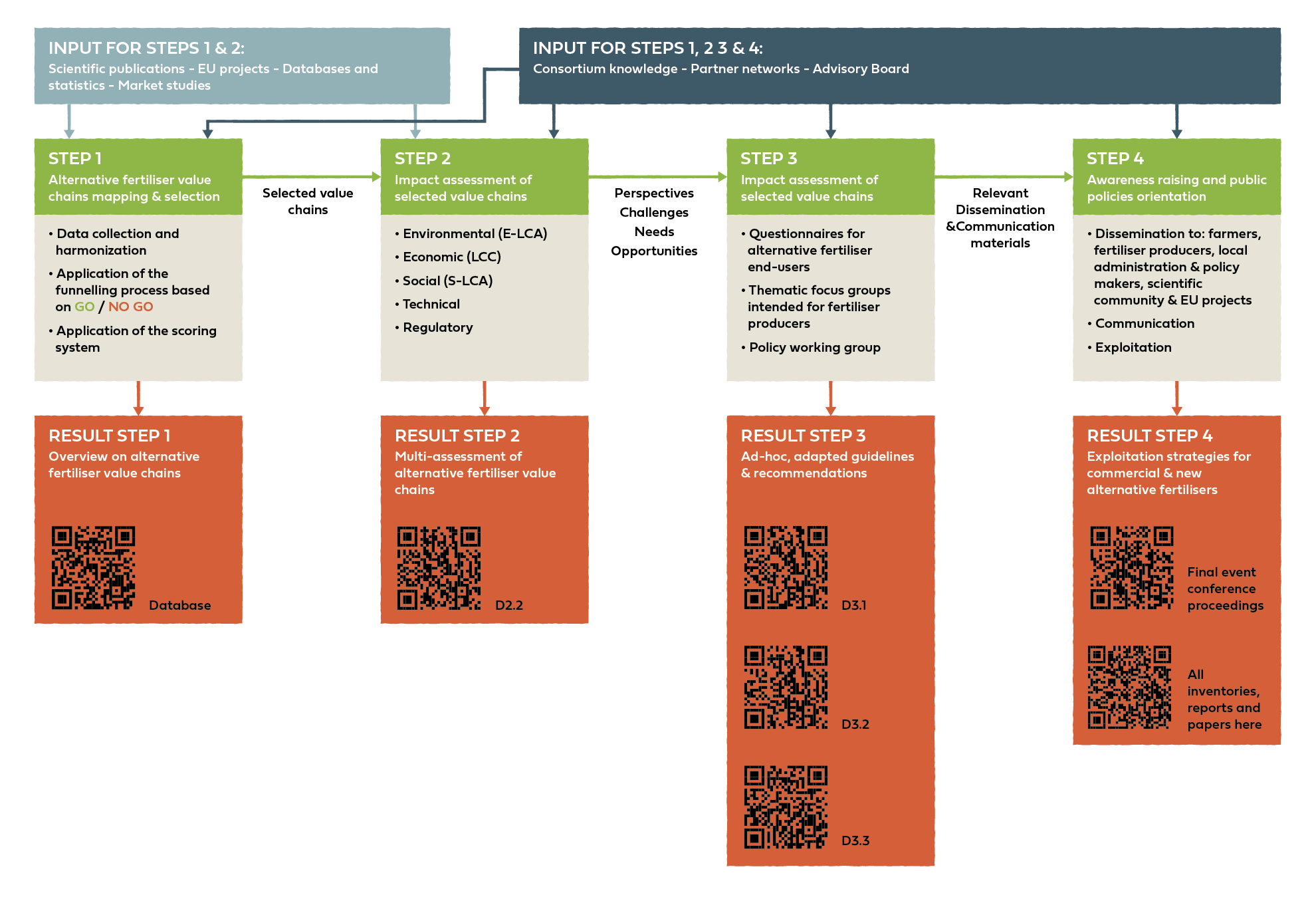 -The 7 most relevant selected: struvite from urban and industrial wastewater, stabilised sludge, composted biowaste, feather meal, solid fraction of digestate and spent mushroom substrate. For the selection, an innovative two-step method (Paredes et al., 2025. Open Research Europe,ORE): 1) Funnelling GO/NO-GO selection which discarded 18 value chains; 2) Scoring method that led to the final selection.