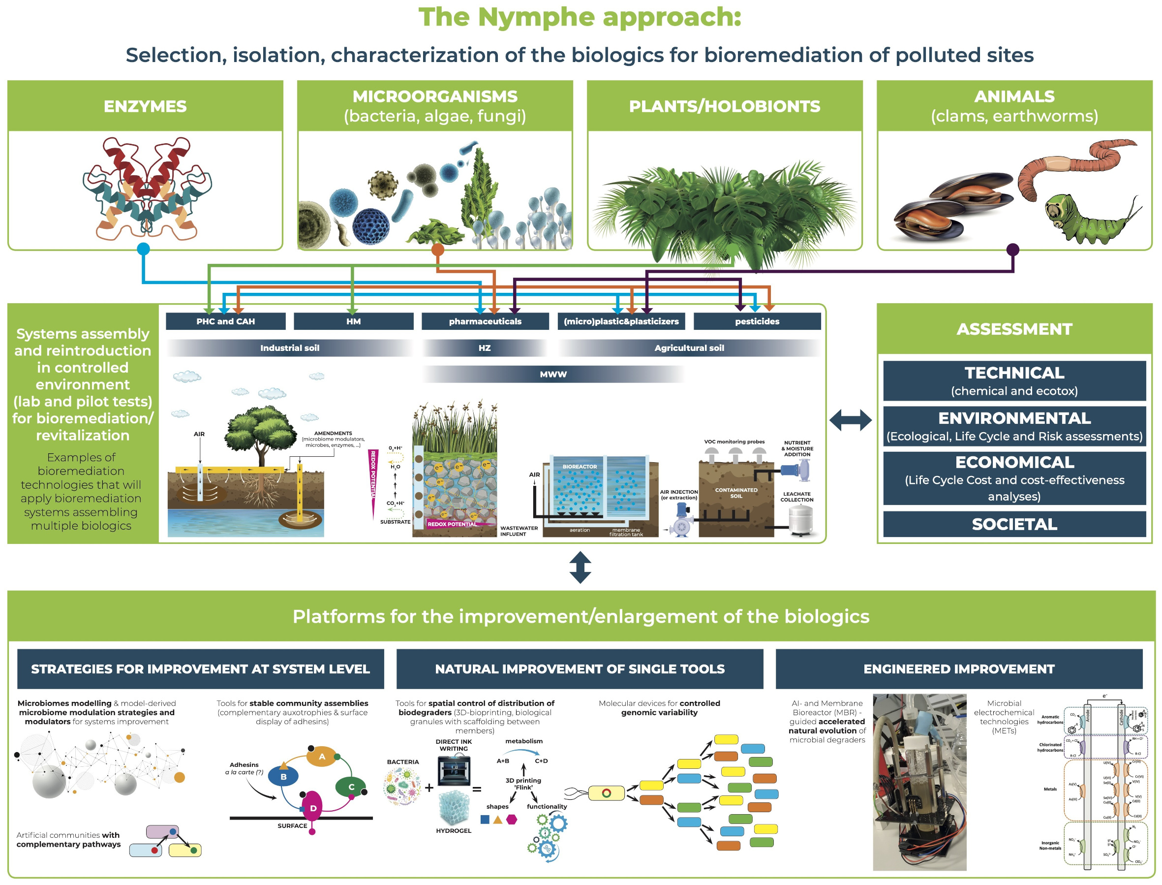In its approach, Nymphe starts at molecular and micro-scale levels and goes through field testing all the way to the macroscopic level. By means of an exhaustive assessment of the technologies’ efficiency and effective communication and dissemination to all relevant stakeholders, including civil society, Nymphe will contribute to overcoming potential technical, environmental, economic, and societal barriers hampering the use of bioremediation, supporting the achievement of a Zero Pollution environment and a healthy planet.