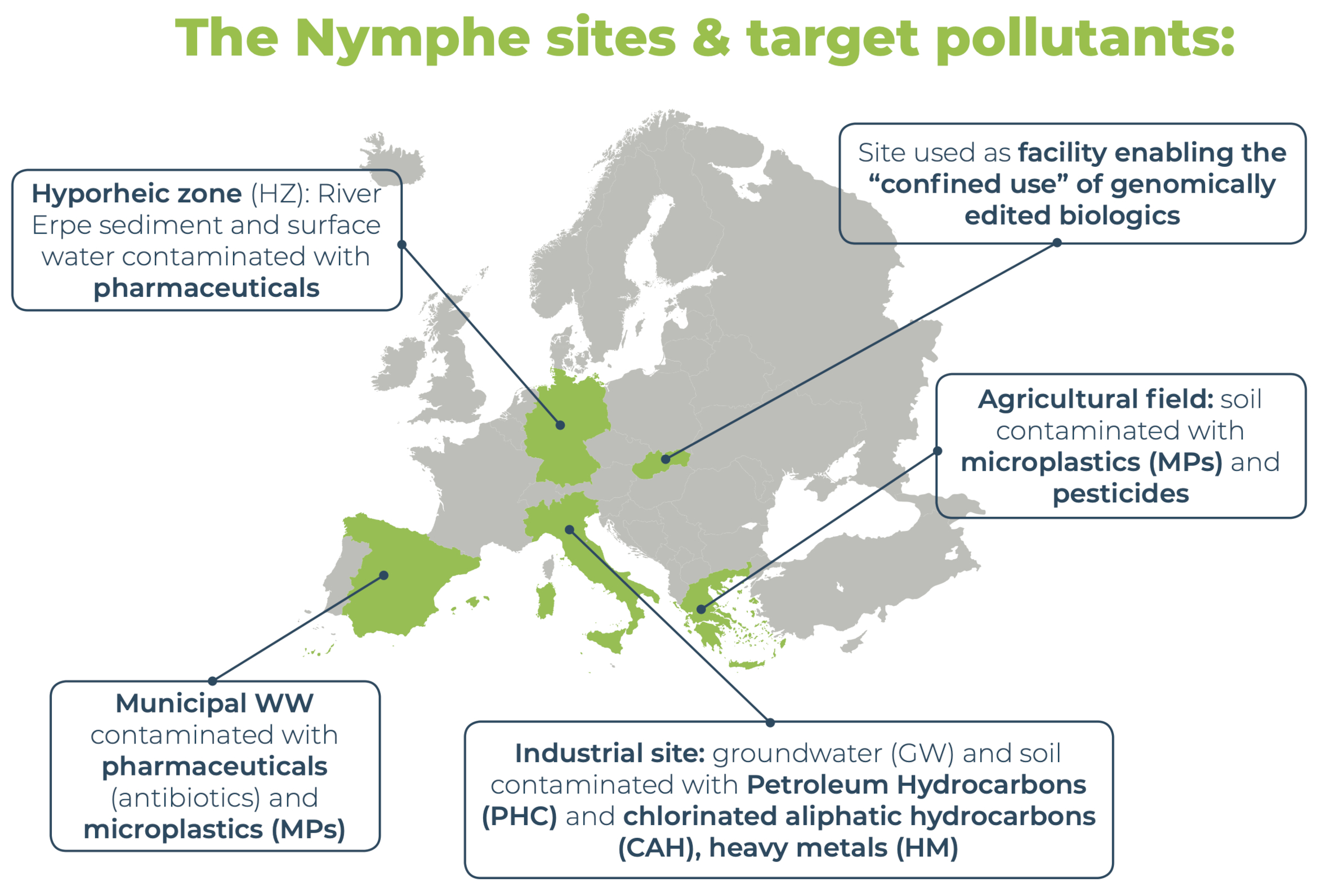 Focusing on 4 real contaminated sites representing common situations of environmental pollution in Europe and worldwide, Nymphe develops its bioremediation/revitalization strategies addressing environmental matrices polluted by mixed “old” persistent toxic substances and contaminants of emerging concern: