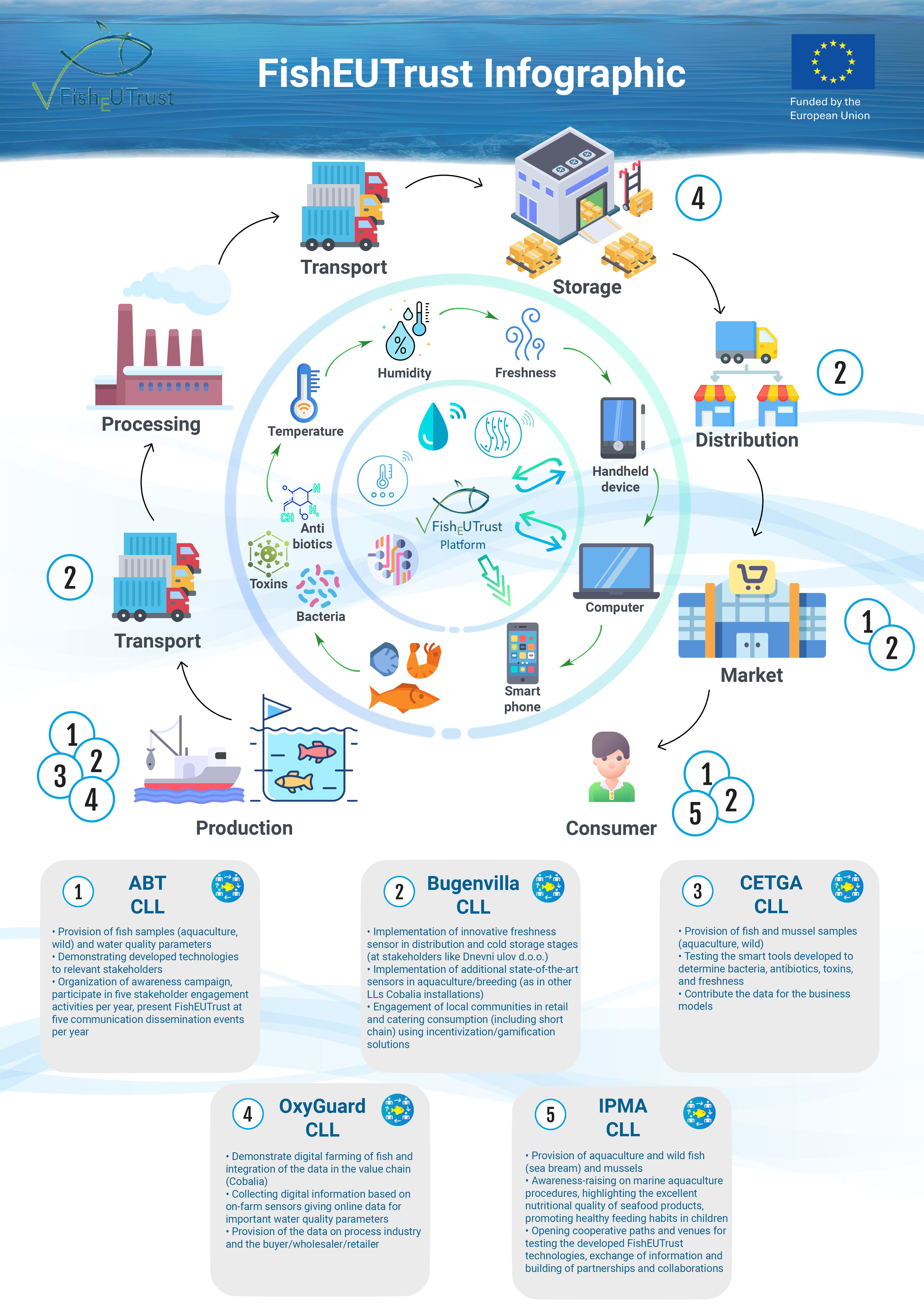 At the heart of FishEUTrust is a common platform linking technology providers, supply chain stakeholders, and regulatory/policy actors. FishEUTrust has established five Co-creation Living Labs (CLLs) in the Mediterranean Basin, the North and the Atlantic seas to enable user involvement in innovation and development processes. These CLLs act as demonstrators to test and validate digital and non-digital supply chain solutions, including business models, protecting cultural and culinary heritage, creating short food supply chains, and exploiting underused fish species. These CLLs will also be used to tailor intervention strategies to stimulate behavioral change and develop tools that guarantee seafood products' quality, safety, and traceability. These aims will be achieved through smart control systems (sensors) and by integrating metagenomics, genetic biomarkers, isotopic techniques and digital technologies (Product Passport and Blockchain). FishEUTrust will conclude by performing an integrated impact assessment and life cycle analysis to quantify the impact of the FishEUTrust project.