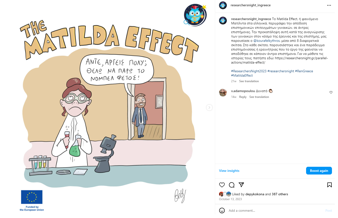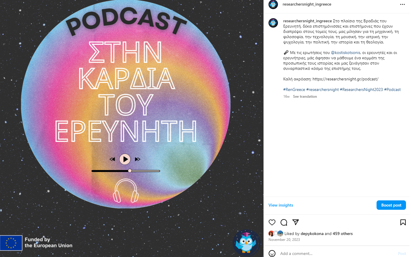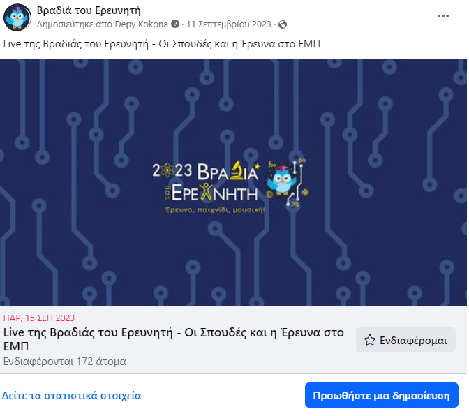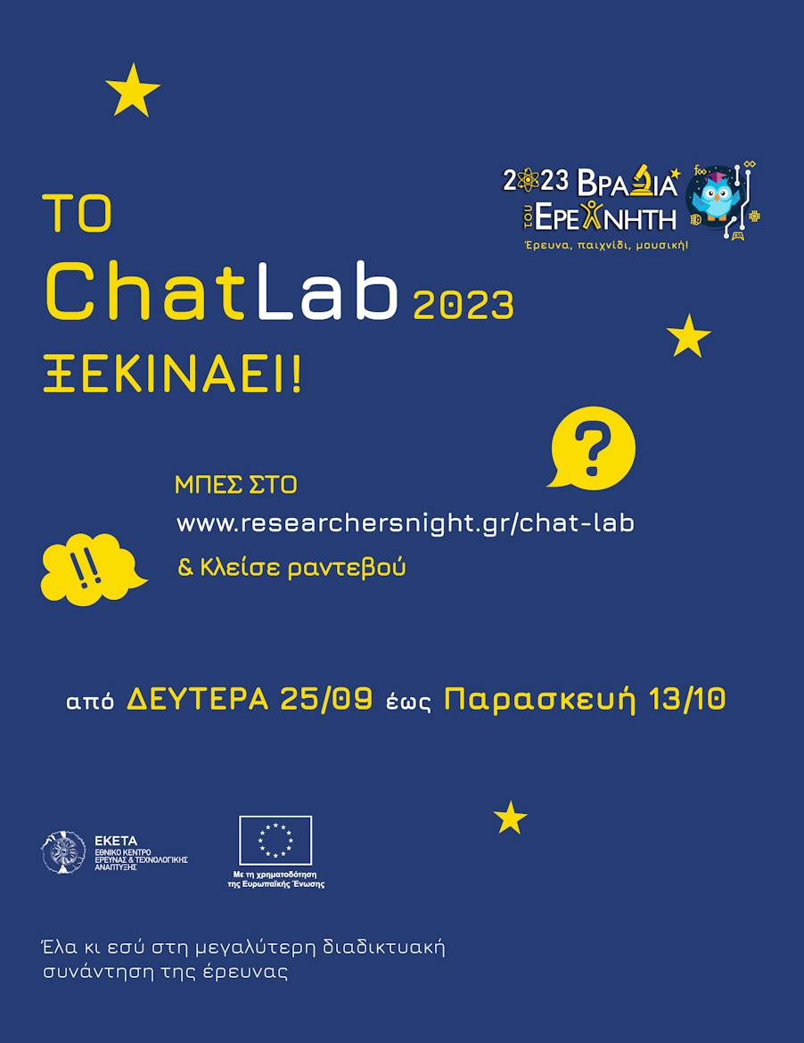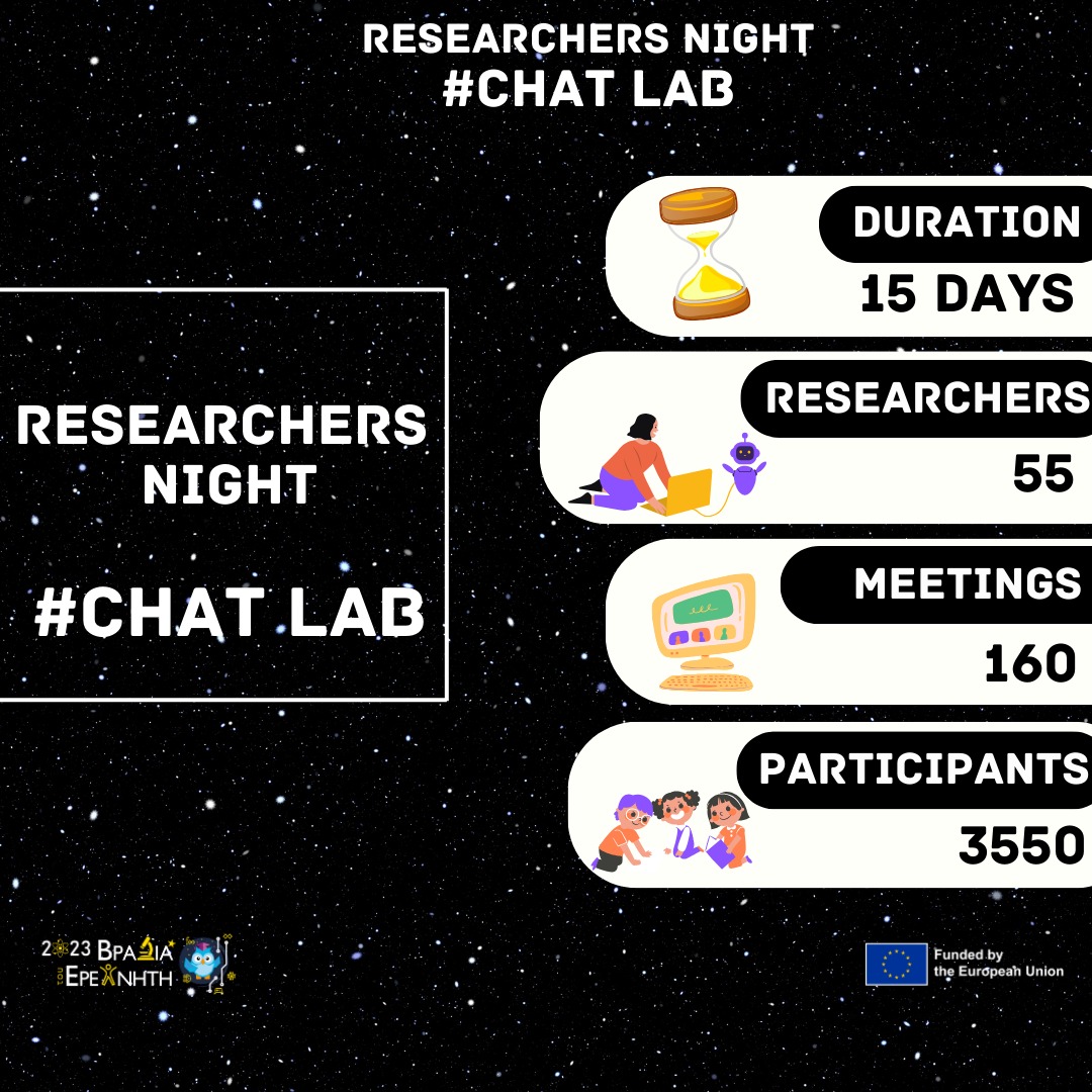 Through the "Researchers at School" initiative, 3,104 students from across Greece interacted with 41 researchers at various career stages, becoming acquainted with the world of research. Additionally, in the "Chat Lab" activity, 160 virtual meetings were arranged between 55 volunteer researchers and school teachers and students, enabling an additional 3,500 students to engage with researchers in online, real-time interactions.