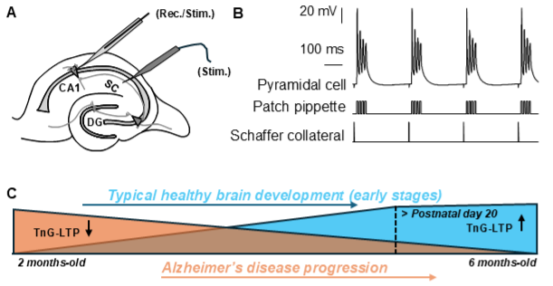Figure caption. Theta-nested gamma oscillations-induced Long-Term Potentiation (TnG-LTP) in the mouse hippocampus, emerging in adulthood and lost in Alzheimer’s disease. A) Schematic representation of a brain slice showing the hippocampus and the placement of the stimulating (Stim.) and recording (Rec.) electrodes in the Schaffer collaterals (SC) and CA1 area. B) Real electrophysiological recording and stimulation protocol for the induction of TnG-LTP showing the recording of action potential firing from the pyramidal cell neuron (top), the stimulation of the neuron delivered via patch pipette (middle), 10 milliseconds after the stimulation of the SC (bottom). C) Schematic representation showing that the magnitude of the plasticity studied (TnG-LTP) increases during typical brain development (blue) in healthy conditions, emerging at adulthood. We observed that this plasticity is present in an adult mouse model of Alzheimer’s disease (orange), while this kind of synaptic plasticity is lost when the disease progresses and is clinically established at 6 months of age.