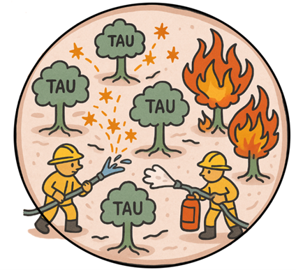 One of the hallmarks of Alzheimer’s disease is the abnormal deposition of the protein Tau. Normally, Tau acts like the trees of a healthy forest, giving stability and structure to nerve cells. But under disease conditions, Tau changes its structure and becomes unstable. Like dry tinder ready to catch fire, misfolded Tau molecules act as sparks that ignite nearby healthy “trees” and ignite new fires. These sparks represent toxic protein clumps (so-called aggregates) that trigger a chain reaction, leading to the larger ‘fires’ of aggregation spreading from cell to cell. The build-up and multiplication of these toxic aggregates over time is thought to be one of the main drivers of dementia.