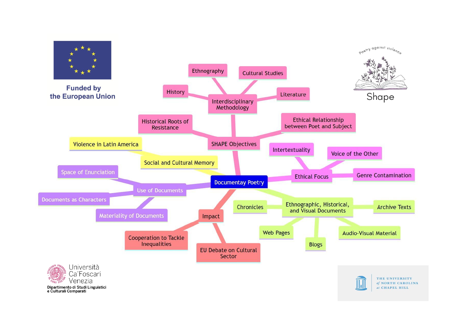 To achieve this, SHAPE adopts an interdisciplinary methodological framework that bridges literature, cultural studies, cultural history, and ethnography. This approach will allow for an in-depth investigation of how documentary poetry contributes to acts of resistance against extreme violence while fostering new cross-cultural reflections on institutional and social oppression in Latin America. Additionally, SHAPE seeks to explore literature’s potential as a means of countering racial and social discrimination. The project is being developed in collaboration with Ca’ Foscari University of Venice and the University of North Carolina at Chapel Hill, strengthening its international and cross-disciplinary scope.