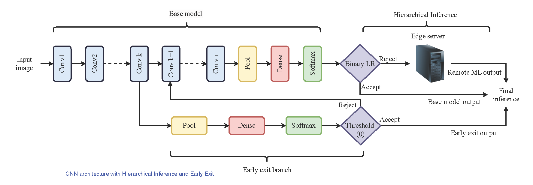 Early Exit with HI (EE-HI): Lower-latency on-device models are necessary for HI implementation. Toward this end, in [Behera, 2024], we proposed the EE-HI system by combining the HI system with the early exit technique [Teerapittayanon,2016], which reduces time per inference by introducing exit branches in between layers of the DL model. To this end, we modify the base models by adding early exit branches to create new local ML models. This allows for inferences to be accepted early based on the likelihood of the data sample being a simple sample. After the data samples are processed by the early exit local ML, HI is applied on top of it. We train a logistic regression module that decides if the local inference (at the final layer) for each data sample suffices or if it needs to be offloaded to the remote server for further inference. The proposed architecture of early exit with HI for Convolutional Neural Networks (CNNs) is shown in the figure below.