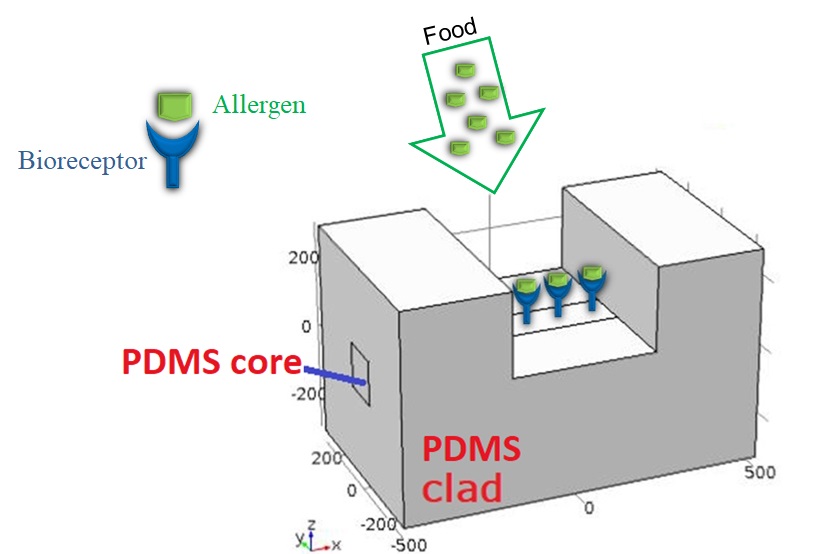 To provide an affordable device, it was decided to use a multimode polymer waveguide made of sole PMDS. Apart from its low cost, this polymer presents different advantage such as biocompatibility, being optically transparent for the intended wavelength of around 850 nm and its optical properties can be easily modified. For example, the base:agent ratio can be tuned to obtain a specific refractive index. This allows us to design a rectangular Waveguide using PDMS only, where the core has a RI of 1.424 and a cladding with RI of 1.417. Initial simulations proved that the PDMS waveguide functioned well using this difference in the refractive indexes of core and cladding. The design and determination of required RI contrast as well as influence of allergens to be detected have been simulated.