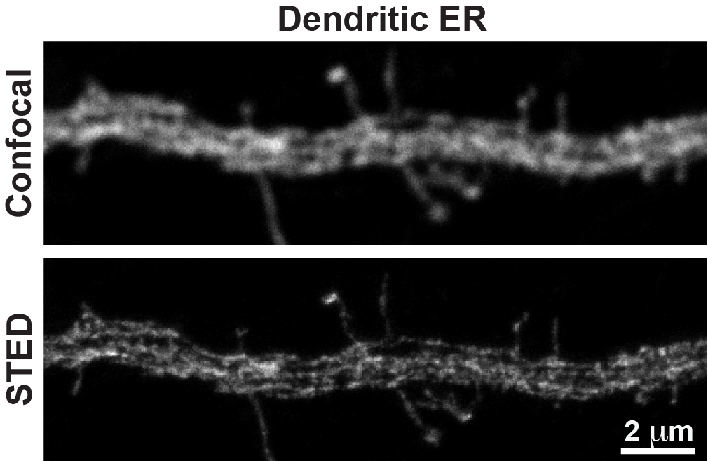 In dendrites, ER presents mainly a tubular morphology that may extend into dendritic spines (small protrusions where most excitatory synaptic transmission occurs), determining their responsiveness to synaptic activity. Activity-mediated dynamics of ER and mitochondria are necessary to uphold synaptic plasticity, and neuronal activity also increases ER-mitochondria contacts. However, studying these processes is challenging because synapses are small and tightly packed structures. Traditional imaging techniques have limitations in capturing the fine details of synaptic structures. Recent advancements in super-resolution microscopy have revolutionised our ability to visualise dynamic changes in living neurons. These techniques can offer unprecedented insight into the organisation and dynamics of dendritic ER and mitochondria upon synaptic activity and plasticity.