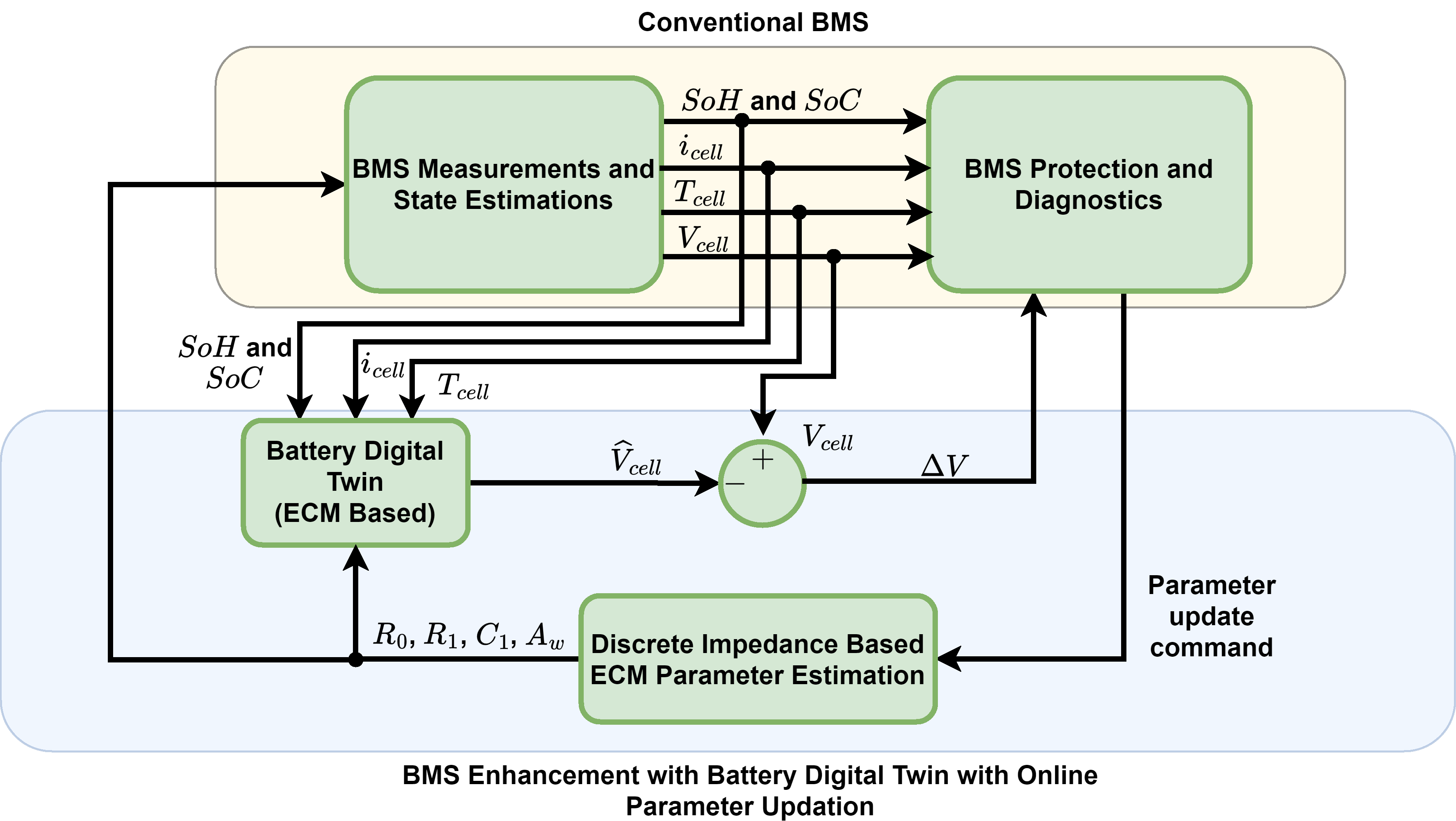 2. An online equivalent circuit parameter extraction method developed provides multiple advantages in the smart battery management system (BMS). This method yields fast and accurate parameter extraction, which can be used as features for machine learning-based algorithms for accurate state estimations. This method can also be used to create an accurate digital twin at cell level that can be used in the BMS for enhancing safety by faster fault prediction and corrective action. It is planned to develop this as a BMS integrated solution that has the potential to compete with online electrochemical impedance spectroscopy (EIS) solutions available in market. Patentability of this technology will also be evaluated.