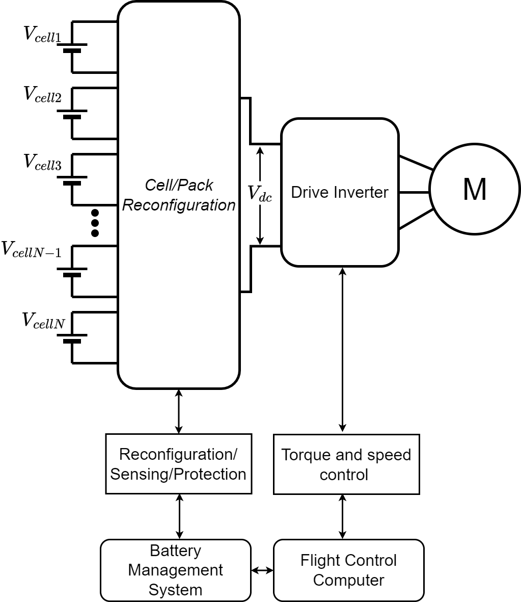 1) Development of an optimized DC bus architecture featuring reconfigurable batteries and wide bandgap (WBG) semiconductor-based multilevel inverters, balancing power converter efficiency and cable weight. Silicon carbide (SiC) is the chosen WBG device.