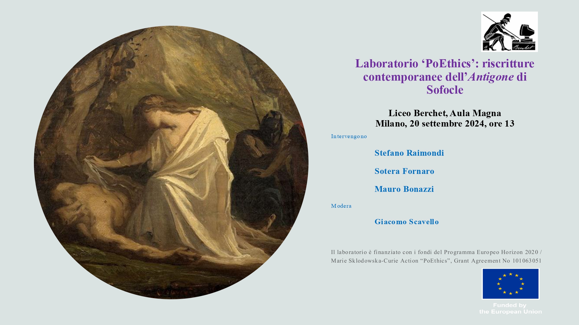 September “Laboratorio ‘PoEthics’: riscritture contemporanee dell'Antigone di Sofocle”, High School Liceo Classico “G. Berchet, Milan, (with the Italian contemporary poet Stefano Raimondi)