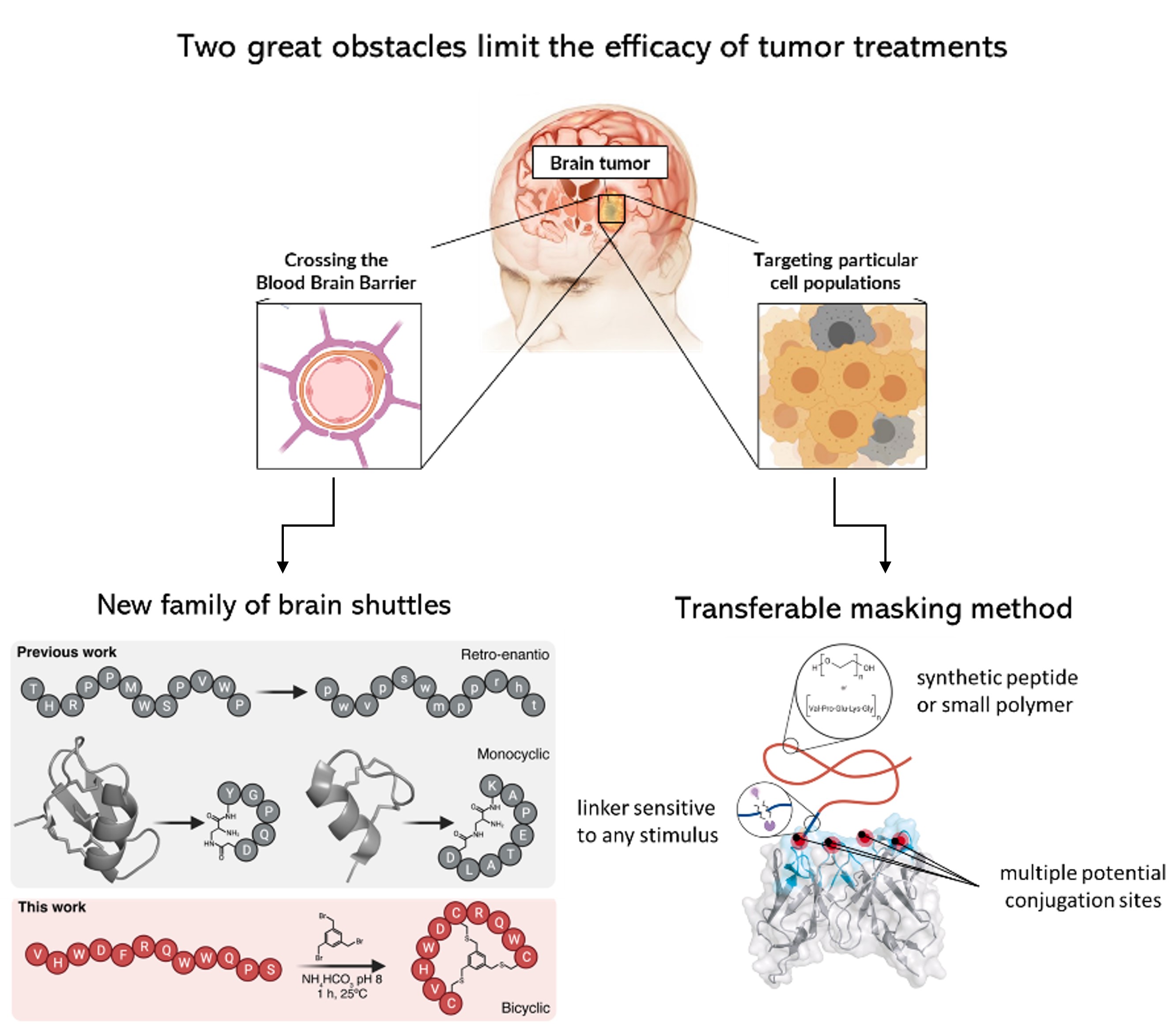 Anti-CD133 masked antibodies may revolutionize the treatment of GBM only if they are capable of reaching all GSCs. Since GSCs are also found in the periphery of the tumour, these biotherapeutics need to cross the BBB. This is mainly formed by brain capillary endothelial cells, which establish tight junctions that hinder paracellular transport. BBB-shuttle peptides are molecules capable of transporting cargoes into the brain parenchyma without disrupting the BBB. Although we and others have developed brain shuttles in the past, there is still a need to discover new and improved shuttles with the capacity to resist protease degradation and transport bigger molecules into the brain. During the course of this action, we have produced a new family of protease-resistant brain shuttles that are able to enhance the transport of antibodies into the brain, which should dramatically increase its efficacy.