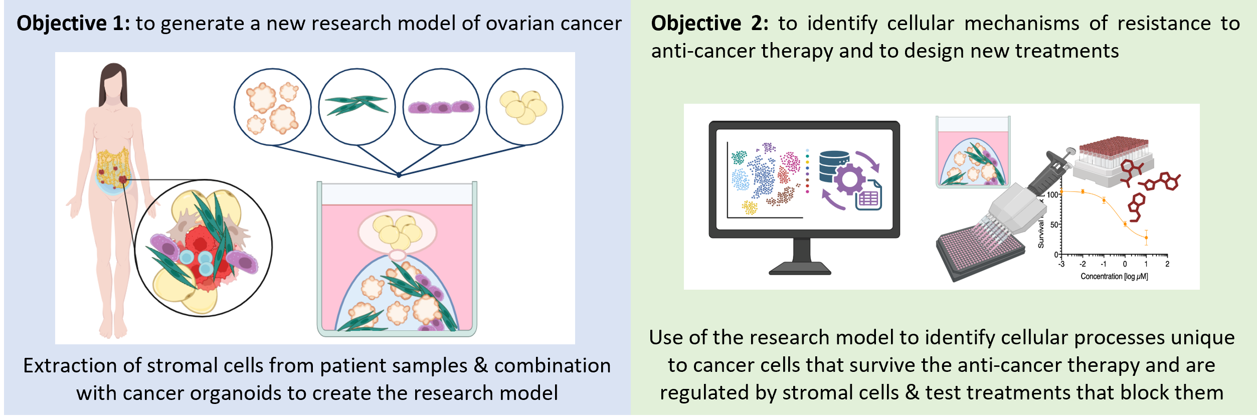 My second goal was to identify the cellular mechanisms of resistance to anti-cancer therapy in ovarian cancer patients and to design new treatments. To do so, I used a technique called single cell RNA sequencing and studied the changes that occur in the cancer cells and the stromal cells of my research models when they are exposed to the anti-cancer therapy given to patients. With this information, I found cellular processes that are unique to the cancer cells that survive the anti-cancer therapy and that are regulated by the stromal cells, and I investigated if such processes could be blocked with additional treatments.