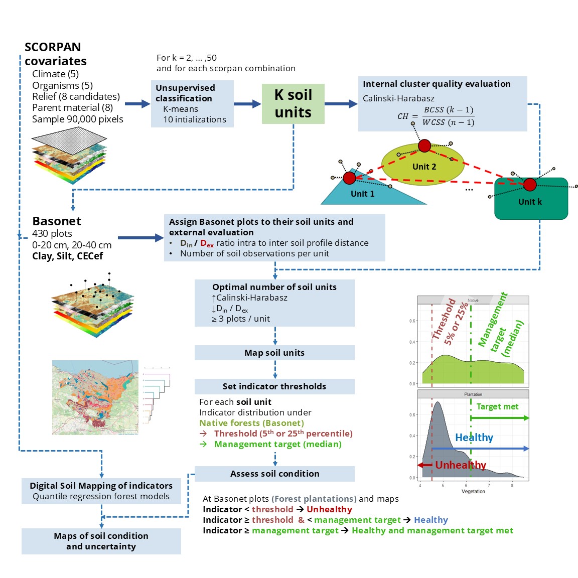 The main goals of SELVANS were to implement a digital soil mapping framework for setting class-specific thresholds and assessing the effects of forest management on soil condition with respect to reference soils. This knowledge will inform sustainable forest management strategies in the Basque Country, maintain soil multifunctionality, counteract the risk of soil degradation, and upscale estimates on soil condition and capability. The second and more conceptual objective was to design a modelling approach for quantifying soil change in the context of long-term intensive soil use, using France as a case study.