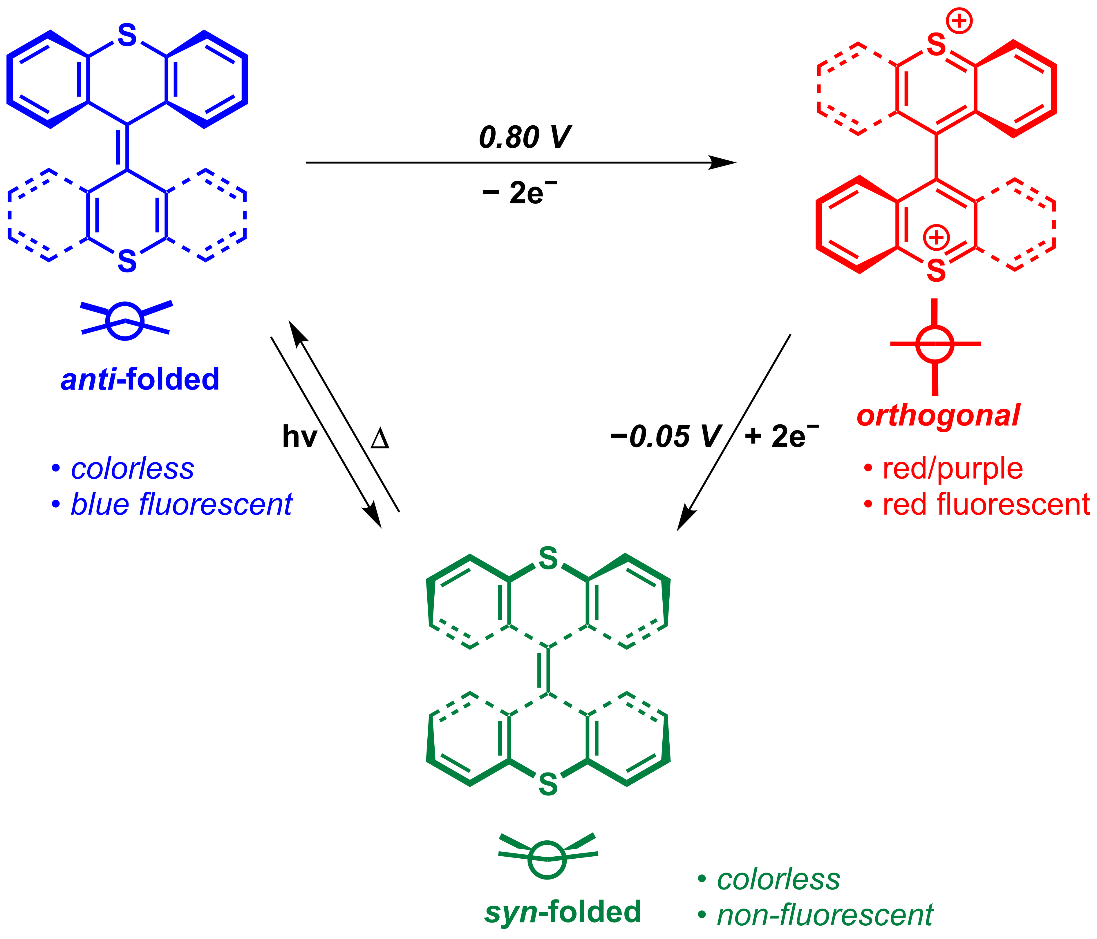 Molecular switches and machines – the tiniest analogues of macroscopic machinery – have the potential to generate enormous impact across multiple scientific and technological applications. This includes, among others, smart materials, soft robotics, energy storage, advanced (molecular) computing, biomedicine and many more. However, this large application scope has only been partially explored. The by far most commonly used energy input to control molecular switches and machines remains light, as it is a convenient source of energy in many applications and can be applied with high spatiotemporal control. This has resulted in the development of numerous photoswitches and light-driven motors and their proof-of-principle applications. In contrast, control of such systems via electrochemical stimulation (i.e. redox) remains much less explored, in spite of its appeal in applications where light may not be an ideal stimulus (for example in opaque environments or at the interface with existing electrical nanotechnologies). This can in part be attributed to the relative lack of redox-active switches that undergo well-defined geometric changes with high reversibility. One such switch is the overcrowded alkene bisthioxanthylidene (BTX), a fatigue-resistant light and redox-responsive multi-state switching scaffold. The objective of this project was to further investigate the fundamental (redox) switching properties of BTX and novel derivatives thereof and to elucidate important design principles of this class of switches. This improved understanding is expected to contribute to the development of the next generation of redox-switches with numerous potential applications such as those listed above.