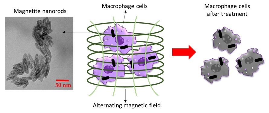 3- The NAs were added to inflammatory macrophages (cell line RAW 264.7) that are responsible for atherosclerosis disease. After ensuring the uptake of the NAs by inflammatory macrophage cells through HRTEM analysis, the cells were subjected to an alternating magnetic field. The analysis of cell viability by confocal microscopy revealed that a significant percent of the treated cells with the NAs and MHT underwent cellular death. As a main result, The NAs showed high degree of anti-inflammation ability which is of high importance in the atherosclerosis treatment.