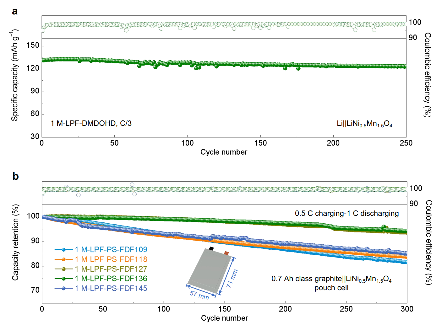 o Electrolyte Systems for High-Voltage Stability: Novel dicarbonate solvents and ternary salt-solvent electrolytes were developed, achieving anodic stability up to 5.2 V and supporting efficient lithium-metal interfaces. These systems resolve challenges in lithium dendrite formation and electrolyte decomposition, paving the way for safer, high-performance batteries.
