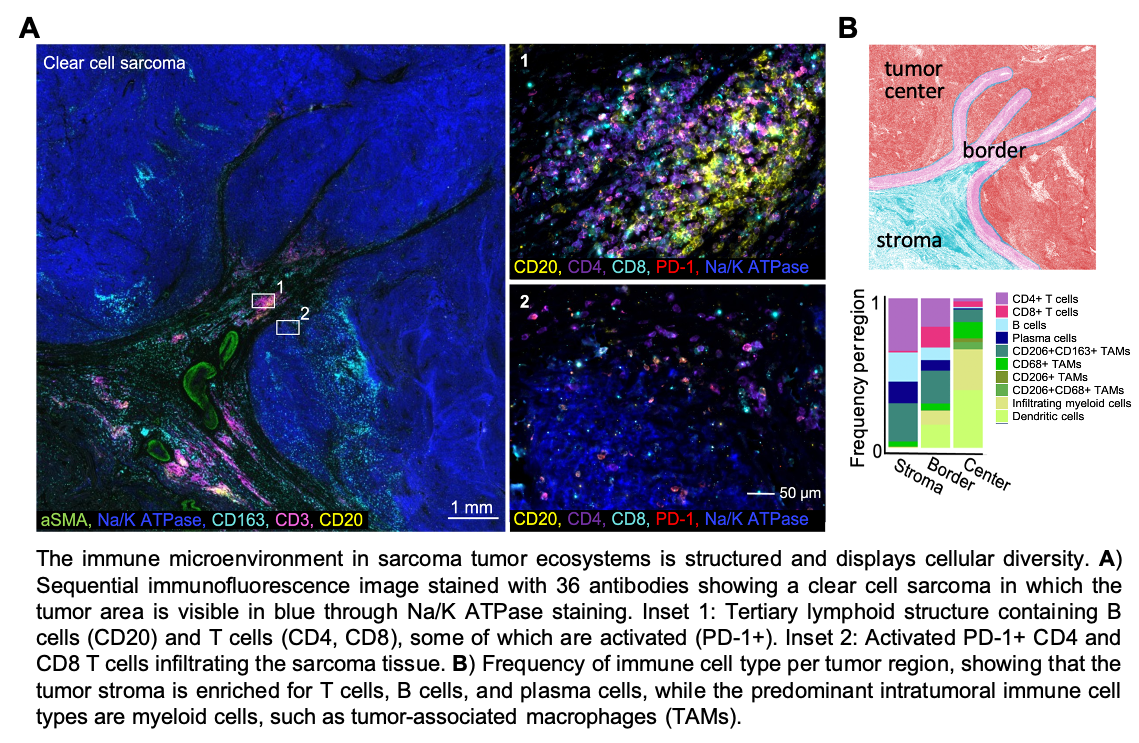 New treatment approaches have been developed that target the tumor microenvironment, which consists of diverse non-cancerous cells that interact with the tumor to either support or inhibit its growth. Together, these interactions establish a tumor ecosystem with dependencies and vulnerabilities. One aim of targeted therapies is to interrupt tumor nutrient and oxygen supplies needed for growth, e.g. by blocking the development of new blood vessels in the ecosystem (Cren et al., 2020). Another aim is to activate an anti-tumor immune attack through immunomodulatory therapeutics to eliminate the cancer cells (Anastasiou et al., 2023). Among the latter, immune checkpoint inhibitor antibodies have become a mainstay of therapy across multiple cancer types (Sharma et al., 2023). The application of such treatment approaches to sarcoma patients is under extensive investigation by basic research and in clinical trials, but so far, success rates varied greatly between patients and sarcoma subtypes (Anastasiou et al., 2023). This is, on the one hand, due to our limited understanding of sarcoma tumor ecosystems, i.e. their specific cellular composition, dependencies, and vulnerabilities. On the other hand, due to the lack of molecular biomarkers that can guide patient selection for specific targeted therapies.