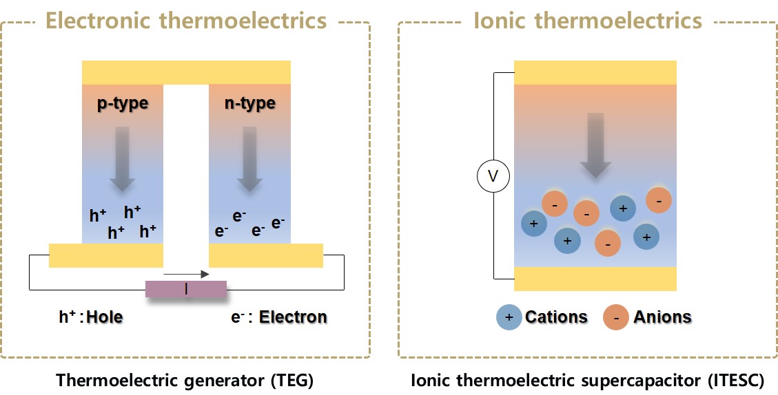- When ΔT is set across an electrolyte, the thermodiffusion of mobile ions from the hot to the cold side induces a concentration gradient, as previously explained. As thermo-diffused ions cannot pass through the electrodes, they accumulate at the interface between electrodes and electrolyte, thereby generating Voutput. If an external circuit is connected, the electronic charge from the electrodes compensates for the previously generated Voutput. This behavior results in an electric double layer at the interface between the electrolyte and electrode. A sufficient surface area of electrodes enables the conversion of heat energy to electricity with the ionic Seebeck effect, creating an i-TE supercapacitor (ITESC). The stored energy (E) of an ITESC originating from its ionic Seebeck effect during thermal charging can be indicated as E=(1/2)C(Voutput)^2, where C is the capacitance.