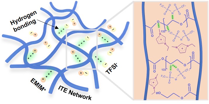 - The fellow proposed a fully stretchable ITESC with a vertical structure that can harvest energy from thermal gradients during deformation (at 60% strain). The fully stretchable ITESC consisted of a hydrogel electrolyte and Au-TiO2 NWs. First, the stretchable electrolyte exhibited excellent air stability for 60 days under ambient conditions (20 °C, 50% RH) without any noticeable degradation owing to the presence of hydroxyl groups (-OH) and nonvolatile EMIM+TFSI-. The ITE exhibited an apparent Seebeck coefficient of 38.9 mV K-1 and an ionic conductivity of 3.76 × 10-1 mS cm-1 at 90% RH.