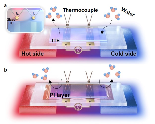 One strategy to increase i-TE performance is to facilitate a specific interaction between the polymer and ions. Hydrogen bonding between EMIM+ and polymers can promote ionic dissociation as well as facilitate the difference in thermo-diffusion between the anion and cation. Recently, a hydrovoltaic voltage induced by the gradient in water concentration along a temperature gradient has been reported to contribute to i-TE measurement with a lateral geometry (illustrated in Fig. 4a). The evaporation of water on the hot side and condensation on the cold side triggers a concentration difference in water and a large hydrovoltaic voltage. The Seebeck coefficient and ionic conductivity measurements were conducted with or without polyimide encapsulation tape (as depicted in Fig. 4a and b) to distinguish between the hydrovoltaic and Soret effects in the output voltage under a temperature gradient. The fellow investigated the role of water molecules in hydrogels and humidity effect. This synergetic contribution of Soret effect and hydrovoltaic voltage can obtain high Seebeck coefficient of 38.9 mV K–1 at 90% RH. The ionic conductivities increased to 3.764 × 10–1 mS cm–1 at 90% RH. In addition, the output voltage and ionic conductivity were barely altered after consecutive 200% stretching/releasing for 100 cycles.