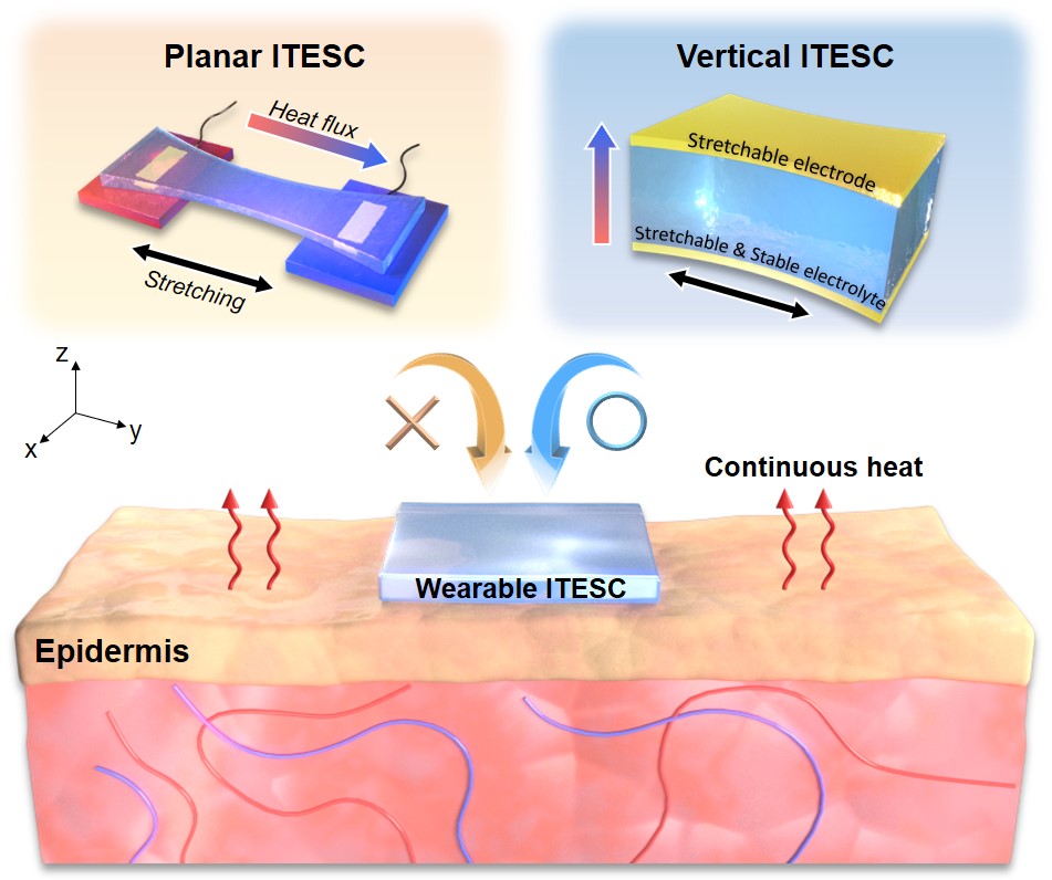 - The fellow developed an ionic TE device operatable on curved surfaces, in which the electrolyte was vertically located between the Au/Cu foil electrodes. It enabled thermal-to-electrical conversion when the device was mounted on electric appliances or human skin. The compatibility with skin curvature owing to the mechanical advantage ensured that the i-TE devices were conformably attached to human skin. Finally, a fully stretchable ITESC was implemented for the first time in which the ITE was sandwiched between stretchable Au-TiO2 NWs electrodes on TPU. The fully stretchable ITESC could be thermally charged at 60% strain and exhibited reliable mechanical stability for 500 repetitive cycles at 50% strain without noticeable degradation.