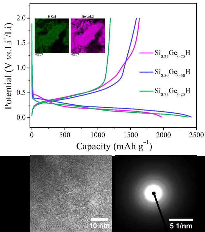 To further understand the lithiation/delithiation mechanisms, we performed ex-situ electrochemical analysis on the Si0.50Ge0.50H material. The study provided key insights into the c-Li15(SixGe1-x)4 phase after lithiation and the a-Si0.50Ge0.50 phase after delithiation, offering new perspectives on the (de)lithiation processes in germanane-silicane alloys. These findings deepen our understanding of their electrochemical behavior and open up opportunities for future research.