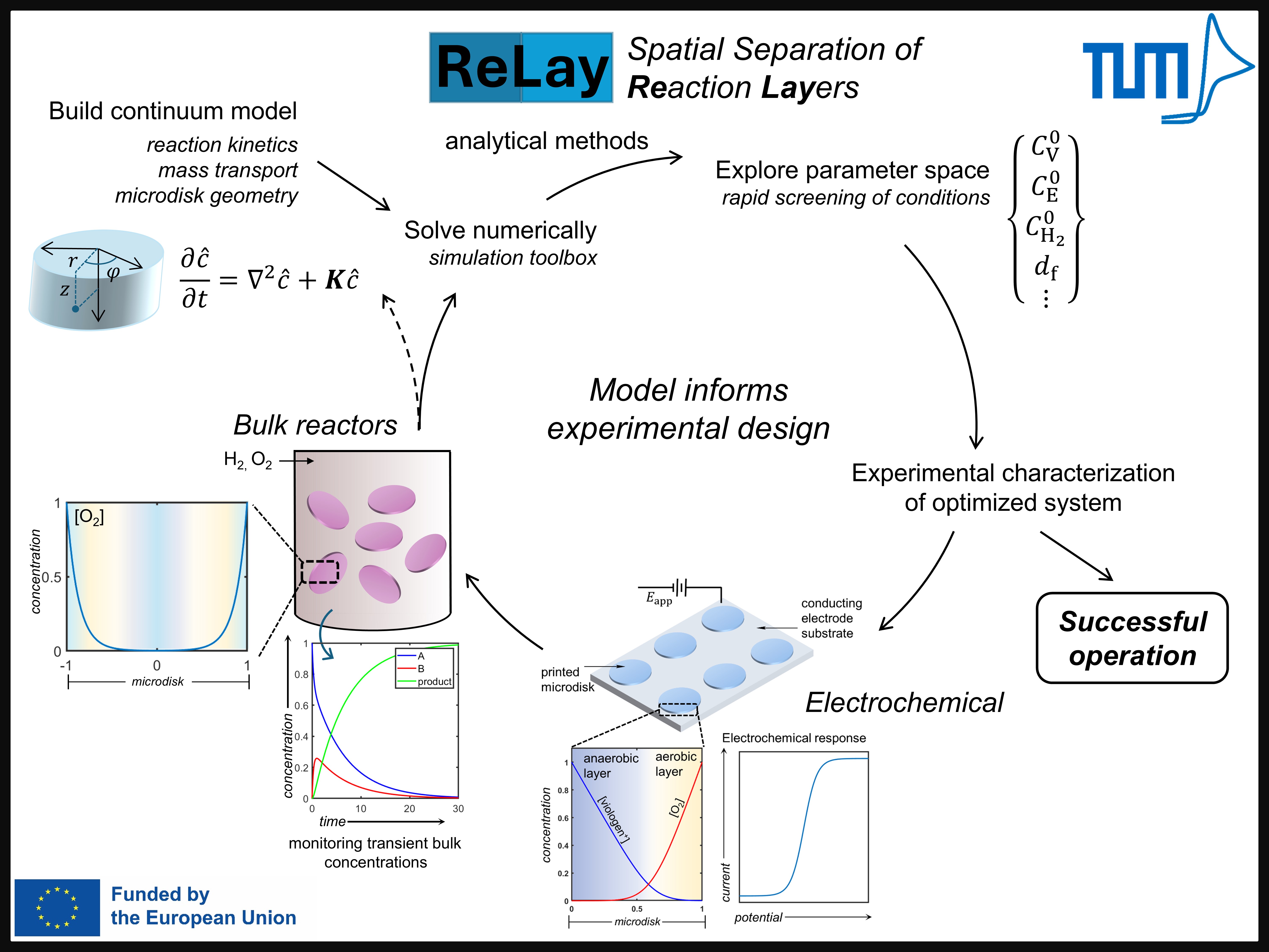 Today’s technology for the biocatalytic production of base chemicals is fossil-fuel based. Moving away from non-renewable and carbon-based energy feedstocks towards renewable hydrogen is a key challenge for current chemical processes. However, biocatalysis has yet to see H2 implemented as a energy source, simply because such H2-consuming reactions are sensitive to O2, whereas many enzymatic reactions driving product formation require O2 as a cosubstrate. H2-driven biocatalysis is not realized today on a large scale because of this need for both O2-sensitive and O2-dependent reactions to operate in tandem. The goal of this Marie Skłodowska-Curie individual fellowship project is to deliver the theoretical framework and experimental validation for novel biohybrid catalytic microdisks capable of carrying out seemingly incompatible tandem reactions by controlling the spatial separation of reaction layers (ReLay). These actions will create a universal platform for H2-driven biocatalysis, which can be implemented directly in current bioreactors.