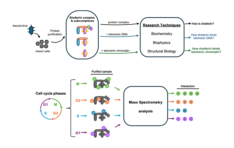 The ends of eukaryotic chromosomes contain a specialized region named telomere, which must be protected to avoid being falsely recognized as broken DNA. The chief guardian of telomeres is a protein complex called shelterin, which is composed of six protein subunits: TRF1, TRF2, TIN2, Rap1, TPP1 and POT1. Shelterin is a dynamic complex, structurally and in composition, and several subcomplexes can co-exist. Despite many years of research, the overall architecture of shelterin and how shelterin protects the telomere remains unknown. Shelterin regulates telomere biology by interacting with other cellular proteins. Failure in telomere protection is associated with telomere-related pathologies such as cancer and aging, and several mutations on shelterin subunits have been found in cancer cells. This project aims to characterize shelterin and its role in telomere protection and regulation with three research objectives using biochemical, biophysical, and structural biology techniques in combination with proteomics. Overall, this research project focuses on understanding shelterin at molecular and functional levels in the cell, information that helps to understand human illnesses.