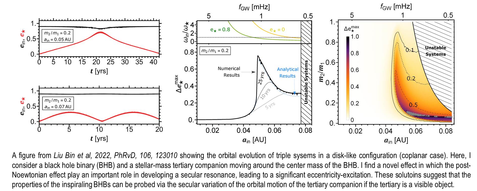 For RO1, the BH interactions in the AGN disk can be broadly divided into two categories: Case I, BHB interacts with the central SMBH; Case II, BHB interacts with another stellar-mass object embedded in the disk. For both cases, the hierarchical triples can be formed due to dissipative-capture. I have studied the dynamics of the BHB under the perturbation of either the SMBH or the stellar-mass companion, considering the PN effect. I have developed a new approach to evolve the three-body system based on the orbital averaging approximation, in which I only averaged over the orbital period of the inner binary of the hierarchical triple. Using this technique, I was able to capture the non-secular effect during the evolution of the BHB. I have found that for coplanar triples how the PN corrections, especially the apsidal precessions of the inner and outer orbits, modify the orbital decay of the BHB around the SMBH for Case I (the paper is in preparation) and trigger the secular resonance, leading to the eccentricity excitation for Case II ( The results were published in Liu B., D'Orazio D. J., Vigna-Gómez A., Samsing J., 2022, PhRvD, 106, 123010).