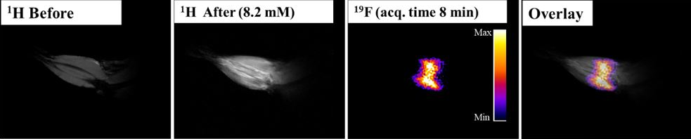 1H and 19F phantom MRI studies and in vivo MRI acquisitions were performed to assess the MRI performance of the probe. In vivo MRI acquisitions following intramuscular injection of MnL1 into the mouse hind leg (c= 2.1 mM, 40 µl) were done by using fast acquisition MRI techniques adapted to fast relaxation and yielded excellent signal to noise ratios in a short time (9 min) and with good resolution (128×128 matrix size).