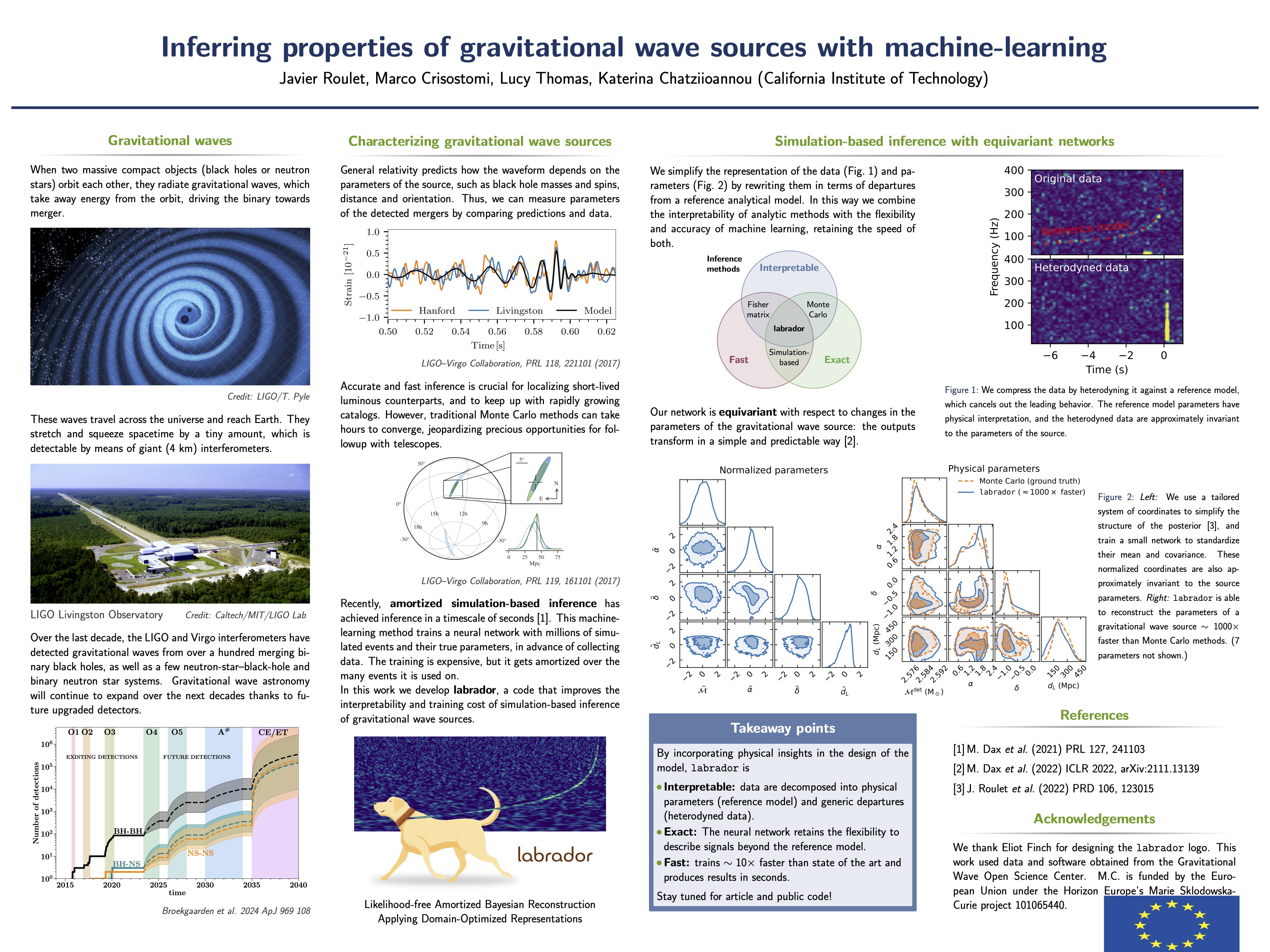 The first achievement is the development of Labrador, a simulation-based inference framework that combines neural posterior estimation with domain-specific physical insights. The method compresses detector data through heterodyning against an optimal reference waveform, reparametrizes source parameters to remove degeneracies, and folds the parameter space to eliminate known multimodalities. These design choices make the network approximately equivariant to changes in source parameters, improving both efficiency and interpretability. Labrador achieves state-of-the-art performance with a full end-to-end training time of about one day on a single A100 GPU, representing a major step toward real-time parameter estimation for gravitational-wave events.