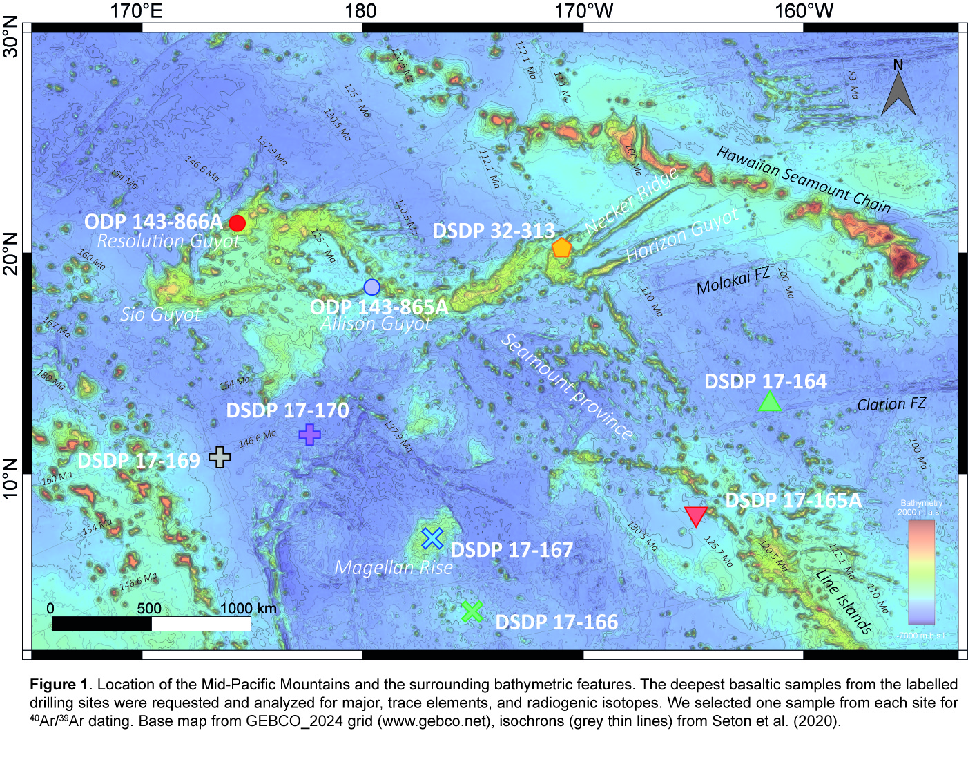 In the past, a series of seagoing expeditions occurring in the 70’s and 90’s targeted several locations within and around the MPM, including expeditions DSDP 17-164, -165A, -166, -167, -169 & -170, DSDP32-313, and ODP 143-865A & 866A, which drilled boreholes on top of guyots, seamounts, plateaus, ridges, and normal ocean seafloor (Fig. 1). Even though the goals of each of the cores were variable (sedimentology, paleontology, paleoclimate reconstructions, for example), in all cases the drilling continued until reaching the basaltic bedrock, penetrating a few cm to m into the rocks. In most cases, limited geochemical analyses were performed on the basalts and very few included radiogenic isotope measurements or 40Ar/39Ar dating, yielding incomplete datasets.