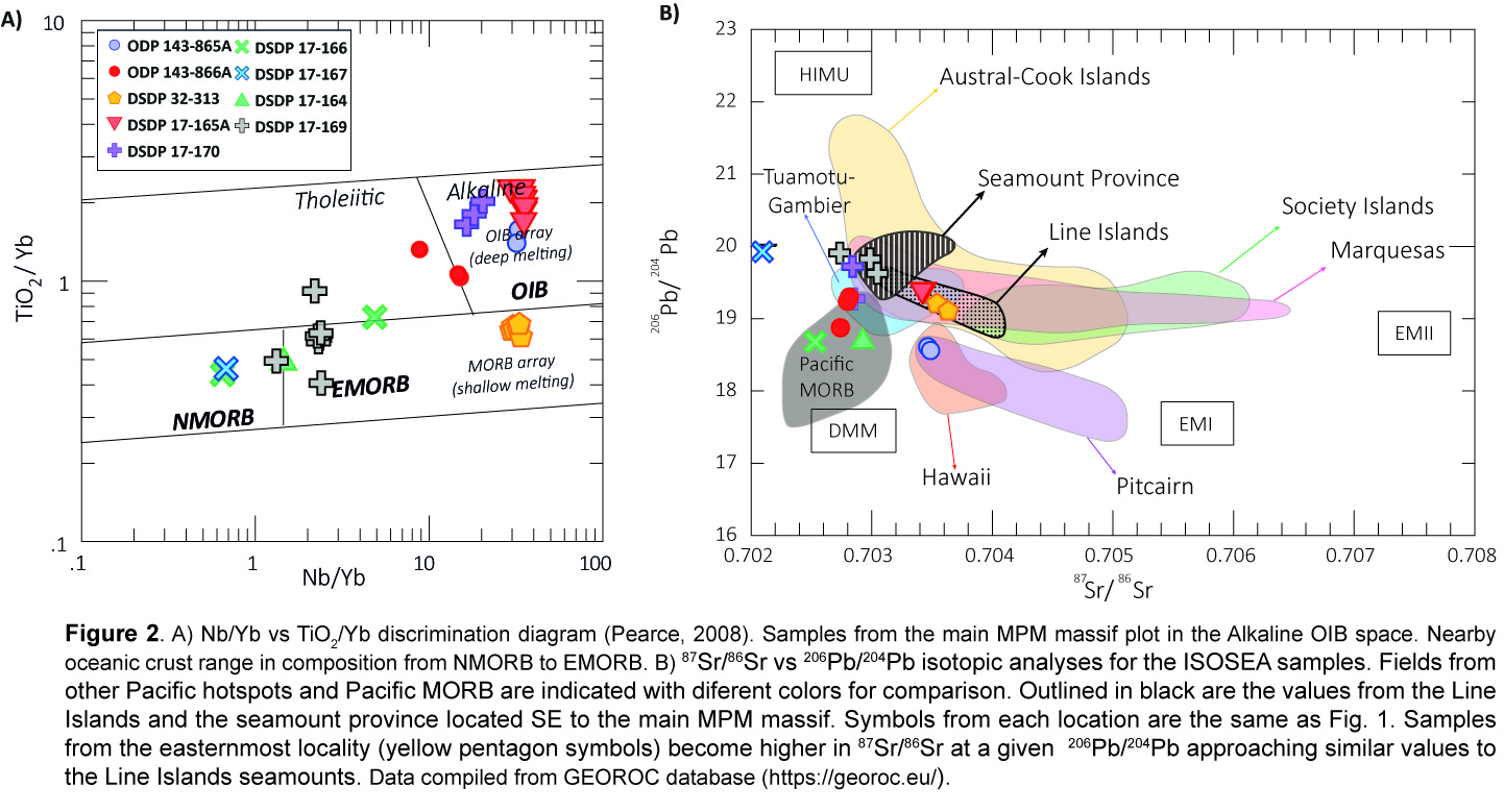 Our results suggest that the single plume model alone cannot sufficiently explain the observed morphology, spatial extent, and compositions of the Mid-Pacific Mountains. For instance, geochemical variations following a west to east trend (older to younger), shows that the basalts become more alkaline towards the east, yet the easternmost location (DSDP 32-313) show distinct lower values of TiO2/Yb, plotting within the shallow melting EMORB field on a Nb/Yb vs TiO2/Yb diagram (Pearce, 2008) (Fig.2A). These samples are located closest to the Necker Ridge and the Horizon Guyot, two prominent volcanic elongated ridges trending SW-NE at the eastern edge of the Mid-Pacific Mountains. Additionally, the radiogenic isotope signatures (Sr-Nd-Pb-Hf) show that these basalts are sourced from a depleted reservoir (DMM) combined with one or more enriched source (EMI, EMII). Towards the east, the samples become higher in 87Sr/86Sr at a given 206Pb/204Pb, approaching similar values to the Line Islands seamounts (Pockalny et al., 2021) (Fig. 2B).