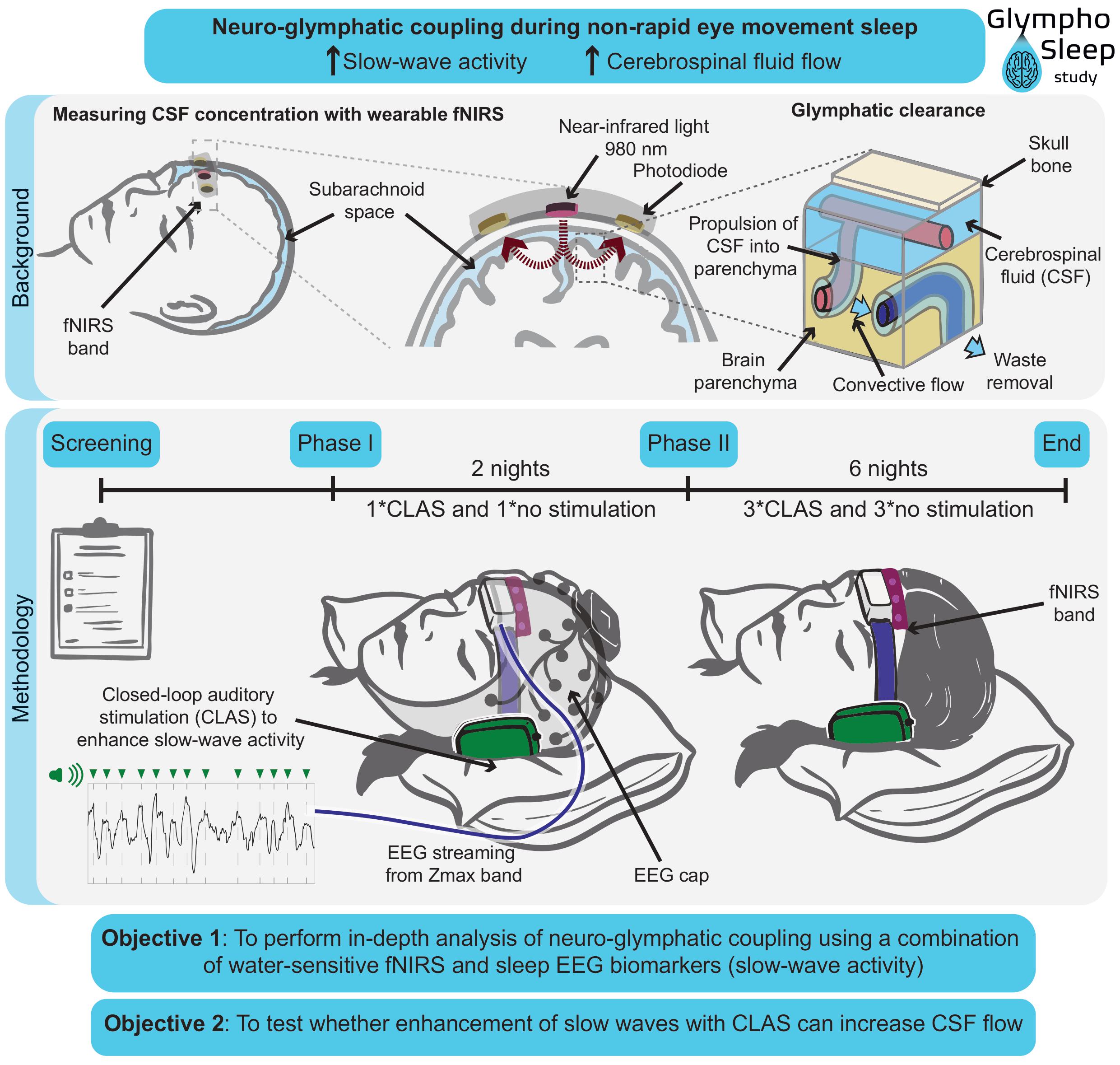 Despite growing interest in this field, due to the lack of non-invasive easy-to-use technological solutions, studying glymphatic clearance in natural at-home sleep conditions has remained a challenge. The goal of the action “Exploring neuro-glymphatic coupling during sleep using wearable technology” (GlymphoSleep project) is to overcome these limitations by validating the usage of the first wearable solution capable of assessing changes in CSF dynamics. This technology relies on the multi-wavelength functional near-infrared spectroscopy (fNIRS) which is sensitive to changes in hemodynamics (changes in blood oxygenation), and, importantly, CSF flow. The device “G-meter” was developed by a team of engineers at the University of Oulu, Finland, the main collaborators of this project. By using a combination of CSF-sensitive fNIRS and EEG to monitor electrophysiological sleep markers, this portable setup allows assessing neuro-glymphatic coupling during natural sleep in an at-home environment. Additionally, the project employed non-invasive closed-loop auditory stimulation (CLAS) to enhance SWA, to causally test the link between sleep electrophysiology and brain clearance. CLAS is a validated method that reliably enhances slow waves without inducing awakenings or altering the natural sleep structure.