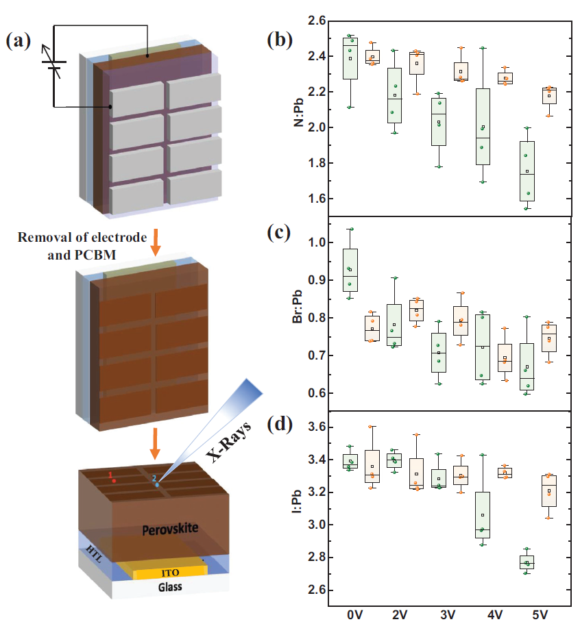 Tracking changes in both the compositional and optoelectronic properties of perovskites as a function of applied bias in perovskite devices, with and without illumination.