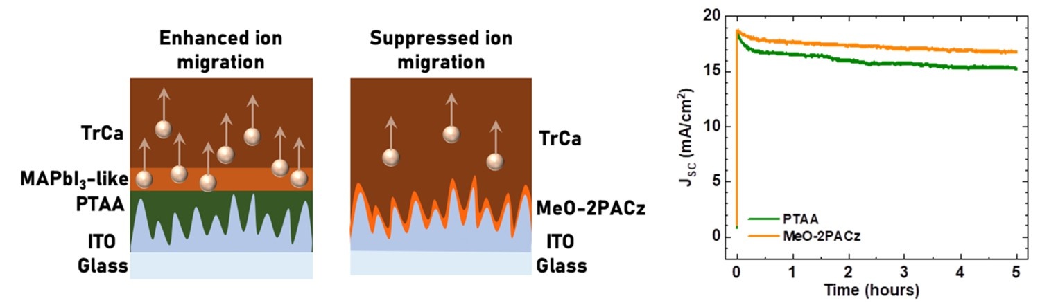 In the IONMIGRATIONPSC project, we are studying how different materials used in solar cells—specifically the hole transport layers (HTLs)—affect the movement of ions inside the device. We are comparing two commonly used materials: MeO-2PACz and PTAA, in a type of solar cell design called “inverted architecture,” and looking at how they behave when a voltage is applied (called forward bias). One focus of our study is the hidden interface between the HTL and the perovskite layer. We found that MeO-2PACz creates a rougher surface, which helps the perovskite layer grow in the intended form, using a stable mix of elements. On the other hand, PTAA has a smooth and water-repelling surface, which causes the perovskite to form in a less stable way, similar to a simpler structure called MAPI, known to break down more easily during use. This uneven layering inside the PTAA-based devices causes ions—especially iodine—to move around more when the device is operating, which leads to faster aging and lower stability. To further understand this, we also studied other similar molecules (called self-assembled monolayers or SAMs), such as Me-4PACz, 2PACz, and Br-2PACz. These tests help us see how the texture and chemistry of the buried interface impact ion movement. Our results show that SAM-based HTLs offer clear advantages over polymer-based ones like PTAA. They help control the structure of the perovskite layer more effectively and reduce unwanted ion movement, which improves the long-term stability of the solar cells. In addition to forward bias testing, we also explored how these solar cells respond to reverse bias (when the voltage is applied in the opposite direction), especially when stored in the dark. This allowed us to study reverse ion migration and better understand the full range of conditions that affect device stability.