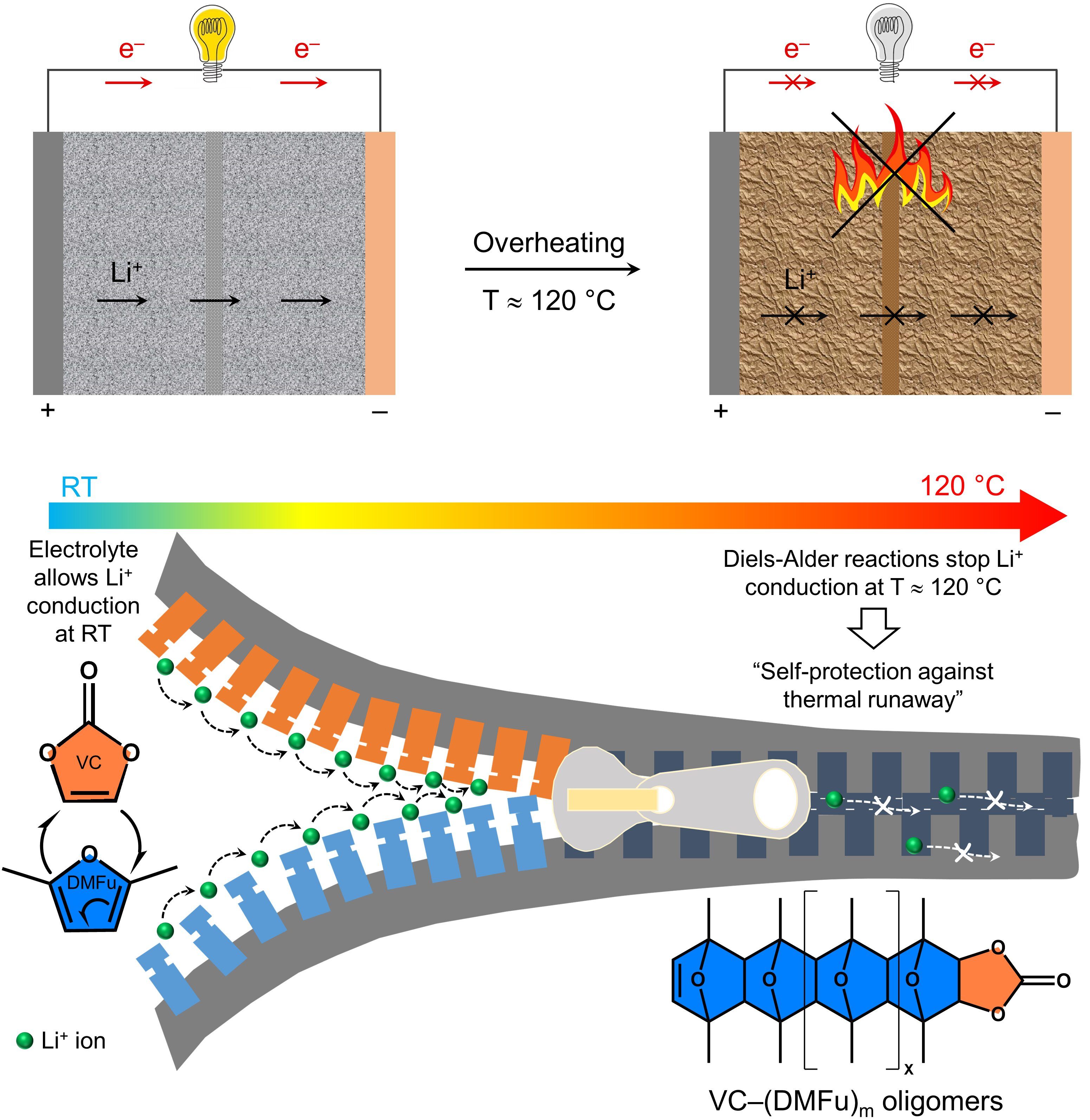 - First-time integration of Diels–Alder reaction chemistry to achieve autonomous shutdown functionality in a liquid electrolyte.