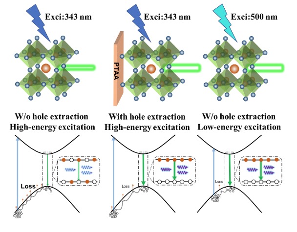 1. With hole extraction via a PTAA layer on top, the hot hole-induced Auger recombination can be suppressed, resulting in amplified spontaneous emission (ASE) threshold reduction in perovskite thin film. This finding provides an inspiring indication that the transport layer can reduce the lasing threshold of perovskite, eliminating the community’s common concern that transport layers increase loss.