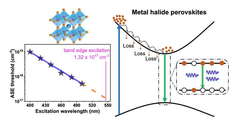 Our second work aims at finding a rational way to estimate the required threshold carrier density that is useful for the design of electrically pumped perovskite laser diodes. We investigate the excitation photon energy dependence of amplified spontaneous emissions (ASE) in state-of-the-art bromide- and iodine-based perovskites. By reducing the excitation photon energy, we observe a large reduction of the threshold carrier density of ASEs and the pronounced bandgap renormalization (BGR) effect. We attribute our results to the carrier cooling process that is affected by coupling of the phonon scattering, giving rise to changes in time delay for carrier to accumulate at the band edge.