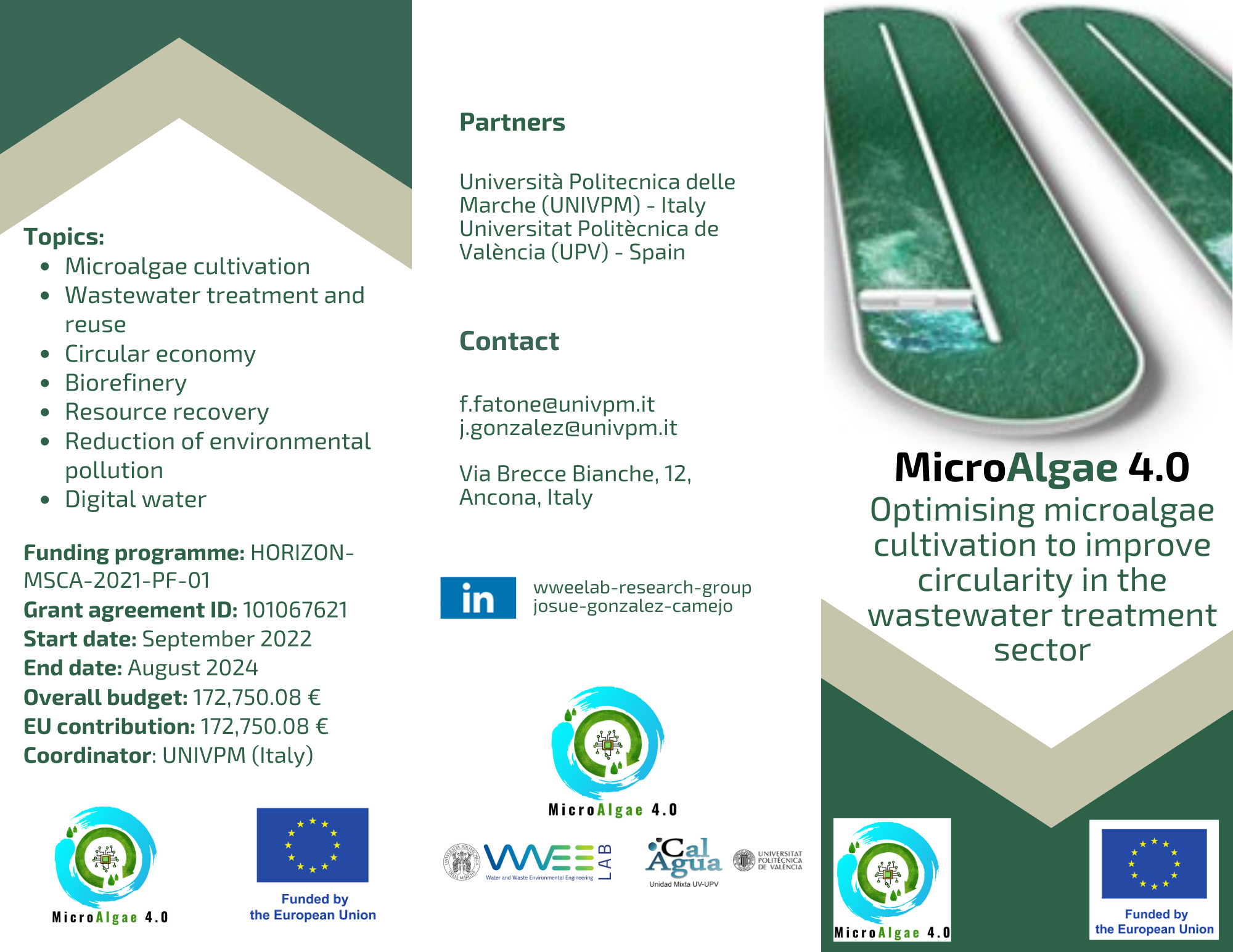 - Training activities on: upscaling of industrial water and waste treatment systems, with special focus on microalgae biotechnology; modelling of microalgae cultivation; machine learning techniques for data analysis and control of the microalgae cultivation process; alternative assessment methodologies; project management, advanced analyses for the evaluation of microalgae properties and emerging pollutants; agronomic indicators to evaluate the biofertilising capacity of microalgae biomass; proposal writing.