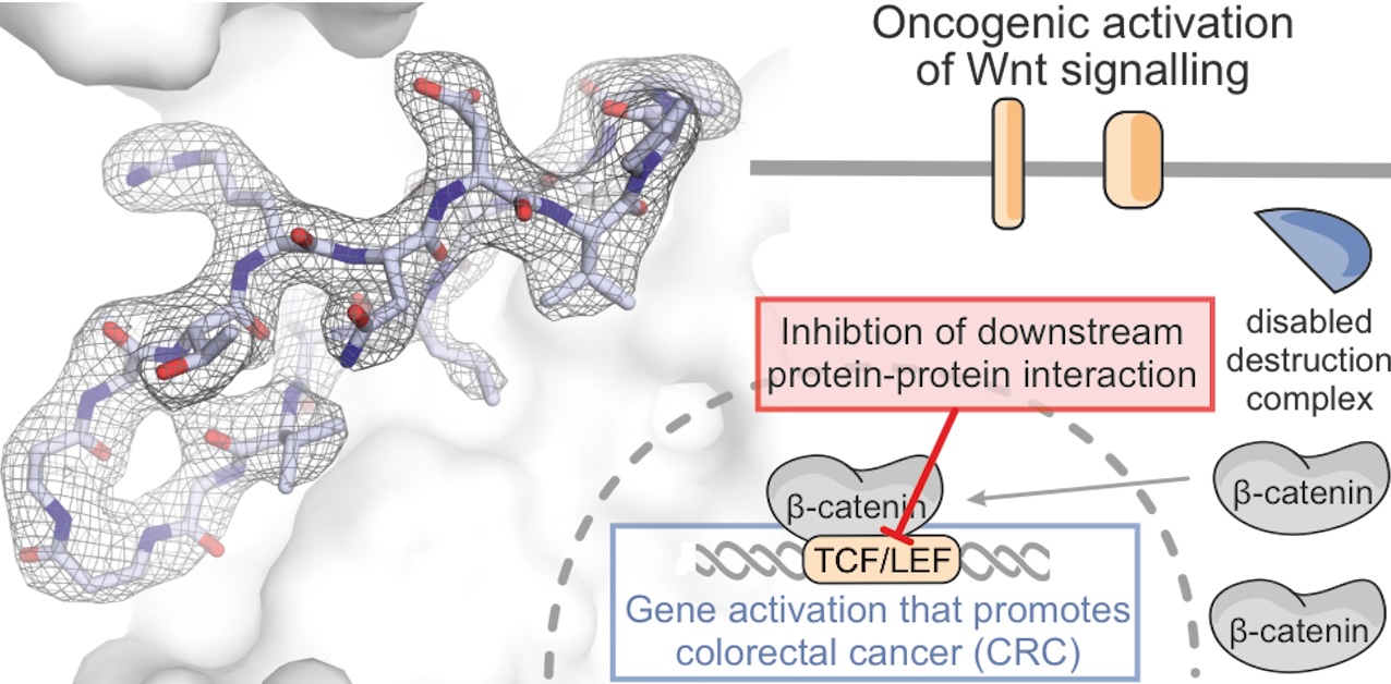 We have identified a family of peptidomimetic agents that bind beta-catenin and inhibit its interaction with the TCF/LEF transcription factors. For the first time, it was possible to obtain a crystal structure of a synthetic molecule bound to a therapeutically very attractive site on beta-catenin. In addition, we have confirmed cellular activity of these inhibitors verifying selective inhibition of the Wnt signalling pathway. These findings provide the ideal starting point for the development of novel therapeutics for Wnt-dependent cancers, in particular for CRC. These first-in-class inhibitors will provide the basis for the development of therapeutics that selectively inhibit oncogenic Wnt signalling thereby affecting the viability of corresponding cancer cells. This can enable targeted therapies for Wnt-dependent forms of CRC. Within this project we further increased the readiness level of these inhibitors with respect to scientific and business aspects.