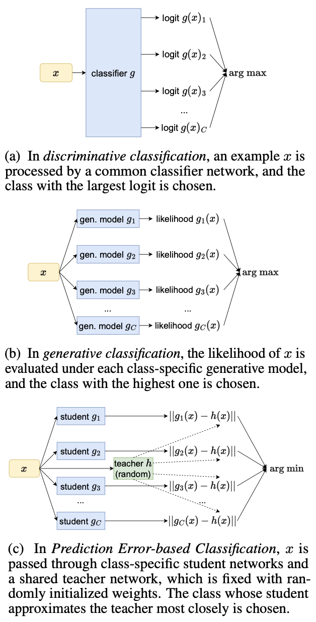 To address the computational efficiency and scalability of generative classification, I worked together with visiting PhD student Michal Zajac. Initially we looked at different ways of sharing parts of the class-specific generative models, but we ended up developing a novel approach for class-incremental learning that is closely related to generative classification, but a lot more scalable and efficient. This novel approach, which we called Prediction Error-based Classification (PEC), is based on the prediction errors of shallow, class-specific networks that are trained to mimic the output of a random teacher network. The attached figure schematically illustrates the difference between discriminative classification, generative classification and our newly proposed approach of prediction error-based classification. This approach obtained remarkably strong performance on a variety of class-incremental learning benchmarks, while being substantially more computationally efficient than generative classification. Besides its strong performance, a nice feature is that this approach can also be motivated as an approximation of a classification rule based on Gaussian Process posterior variance.