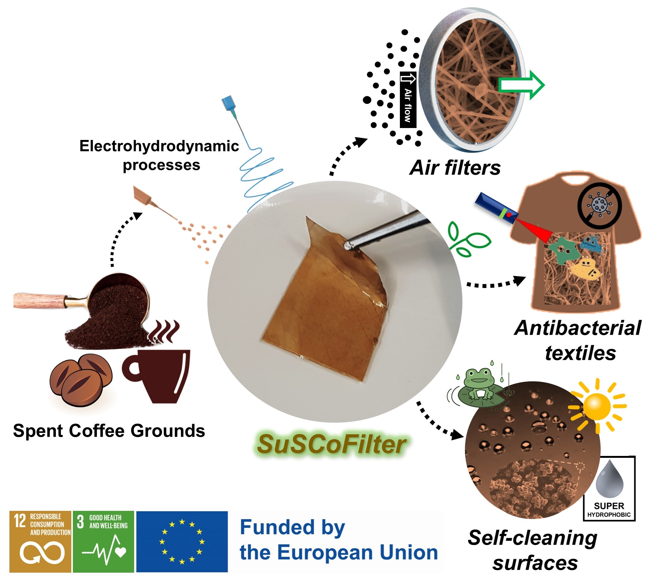 While the primary application of SuSCoFilter focused on air filtration, the project's innovative approach to SCG repurposing unlocked further applications, extending its impact beyond the initial scope. The developed method for processing SCG enabled the creation of light-responsive antibacterial textiles and superhydrophobic interfaces, both of which serve distinct but equally impactful roles in health and environmental applications. Antibacterial textiles offer adaptive protection against harmful bacteria and are valuable in medical and industrial contexts, where material reusability and sterility are paramount. Meanwhile, superhydrophobic interfaces—achieved by modulating SCG with fatty acids to control surface energy—provide self-cleaning surfaces that repel contaminants, further showcasing the versatility of SCG as a sustainable resource.
