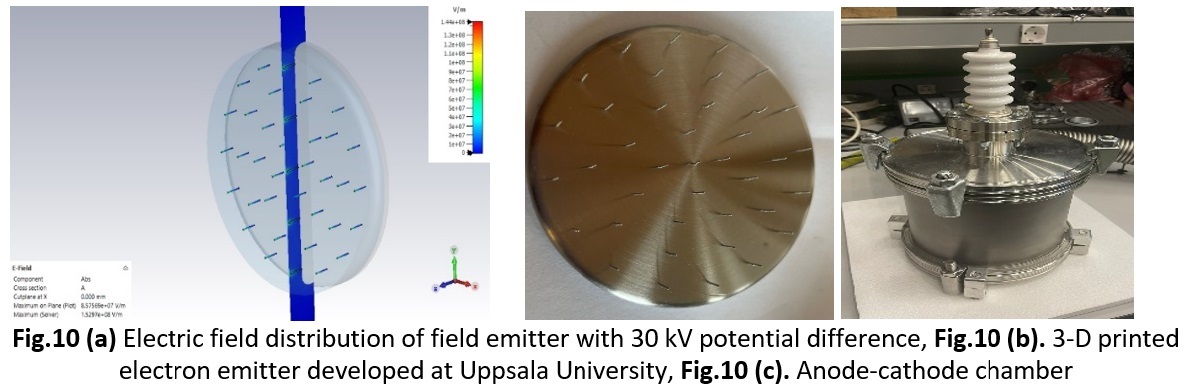 In parallel, work on advanced field emitters focused on developing compact, high-current-density electron sources for integration into high-power vacuum devices. Figure 10(a) illustrates the electric field distribution of the emitter under a 30 kV potential difference, highlighting uniform field enhancement across the emitter tips, which is essential for stable electron emission. Figure 10(b) presents a 3D-printed field emitter prototype developed at Uppsala University, demonstrating the viability of additive manufacturing for precise, scalable cathode designs. Finally, Figure 10(c) shows the anode-cathode assembly chamber, where experimental testing of the field emitter setup is performed.
