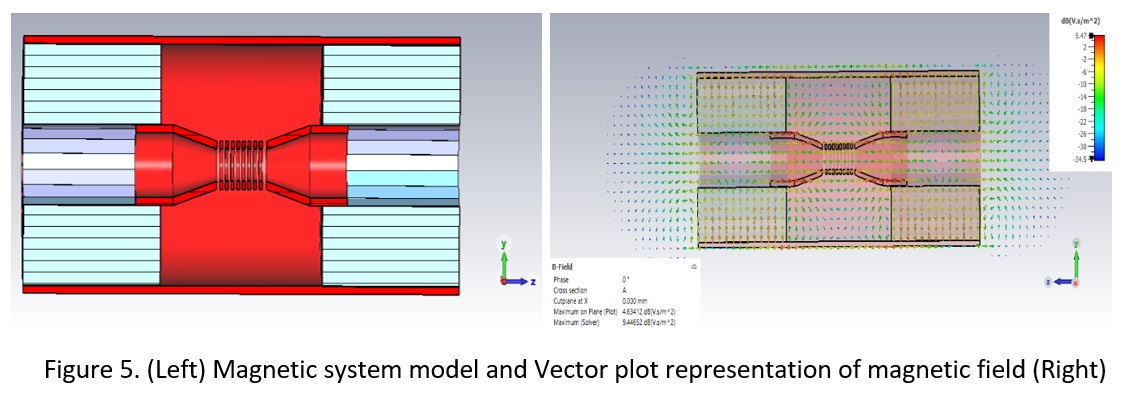 We designed a magnetic system/circuit based on permanent magnets to improve efficiency and sustainability. Figure 5 shows the magnetic system model (Left) and vector field plot (Right), confirming axial field uniformity in the interaction region. This ensures stable electron dynamics for efficient device operation.